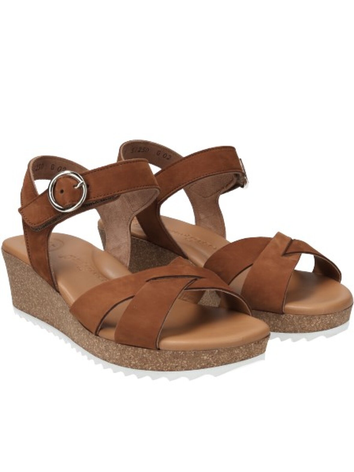 Klassisk sandal fra Paul Green i cognac farvet nubuck. Rem om anklen der lukkes med et spænde. Kilehæl med en højde på 5 cm. Plateau for 2 cm