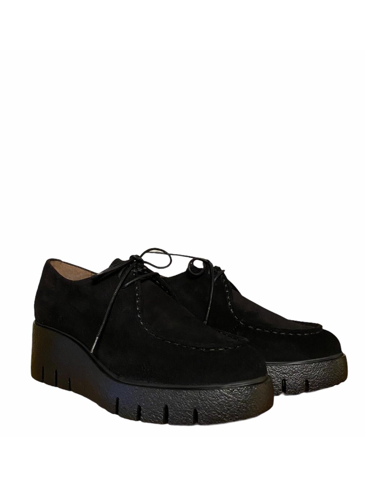 Smart snøresko fra Wonders i sort ruskind, foret med skind. Kilehæl med en højde på 5,5 cm samt plateau for 2,5 cm.