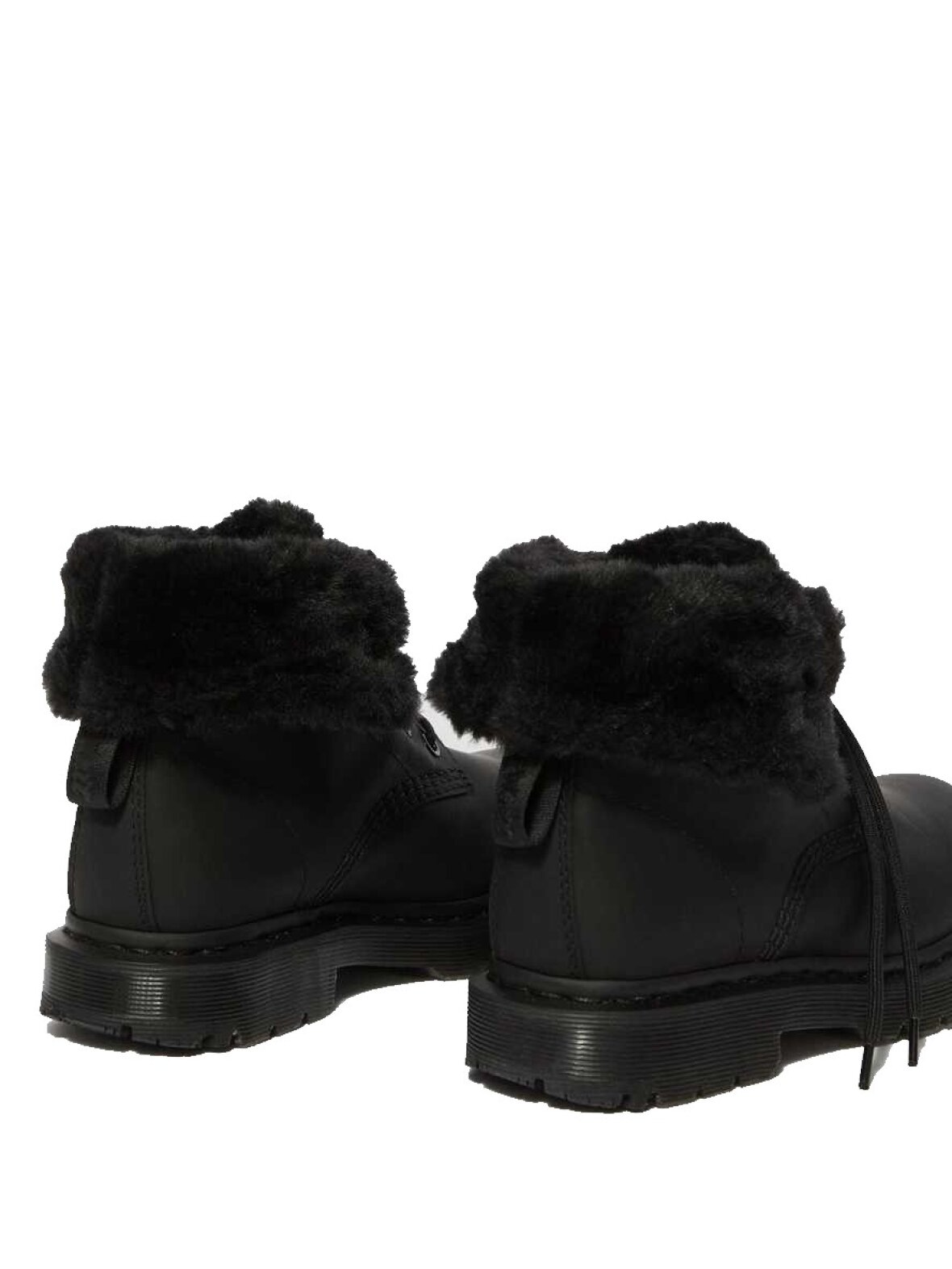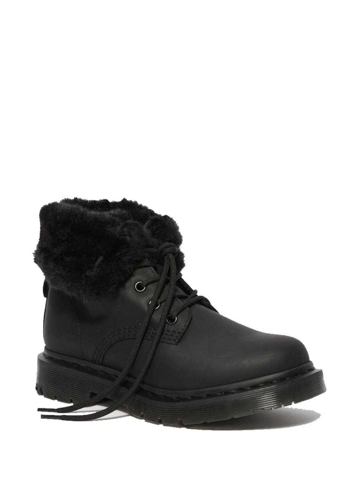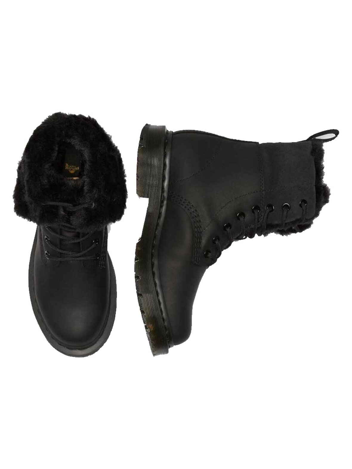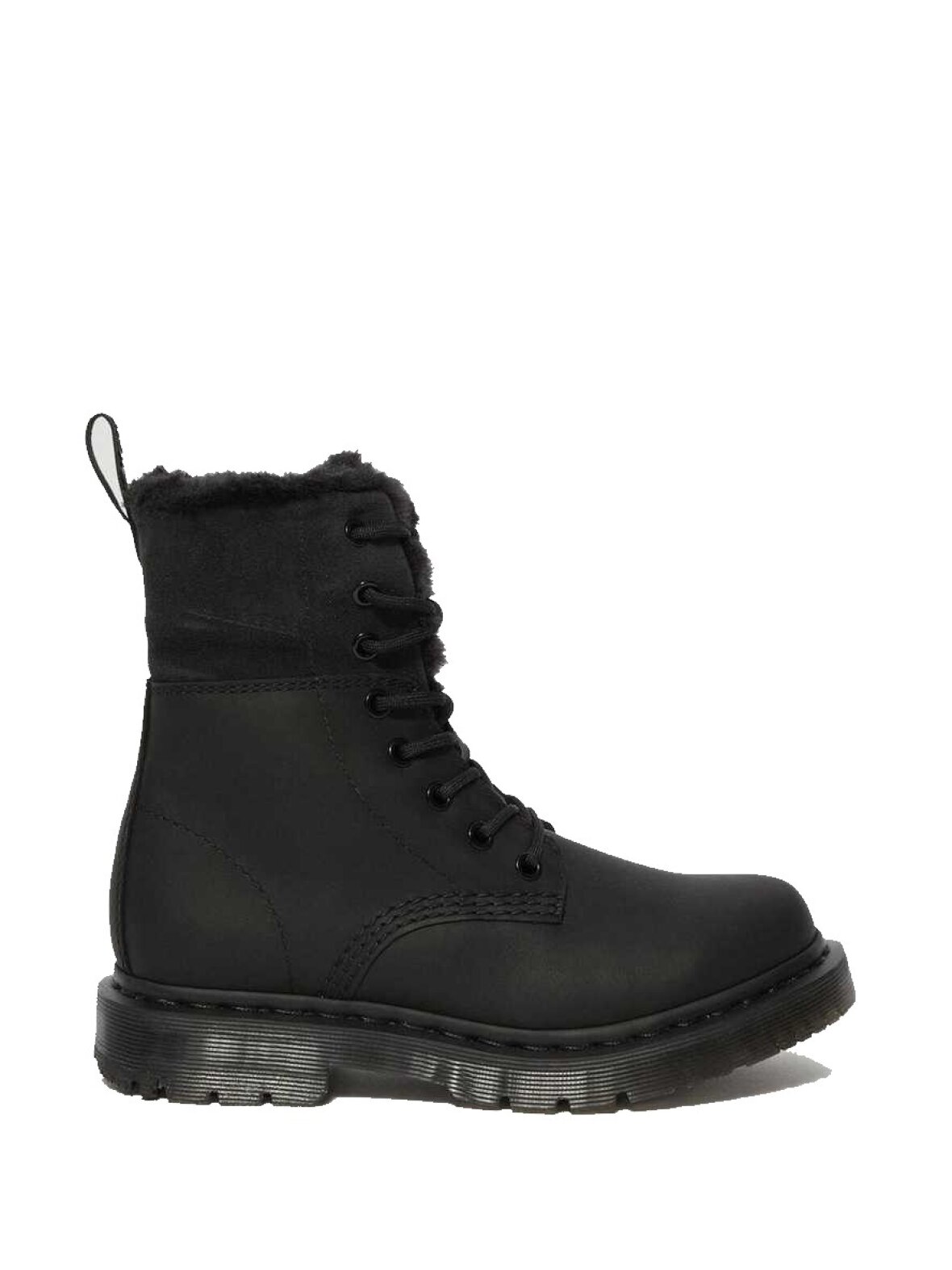 Klassisk Dr. Martens støvle i sort blødt skind, foret med sort pelsfor som går helt ud i tåpartiet. 8 huller til snørrebånd.