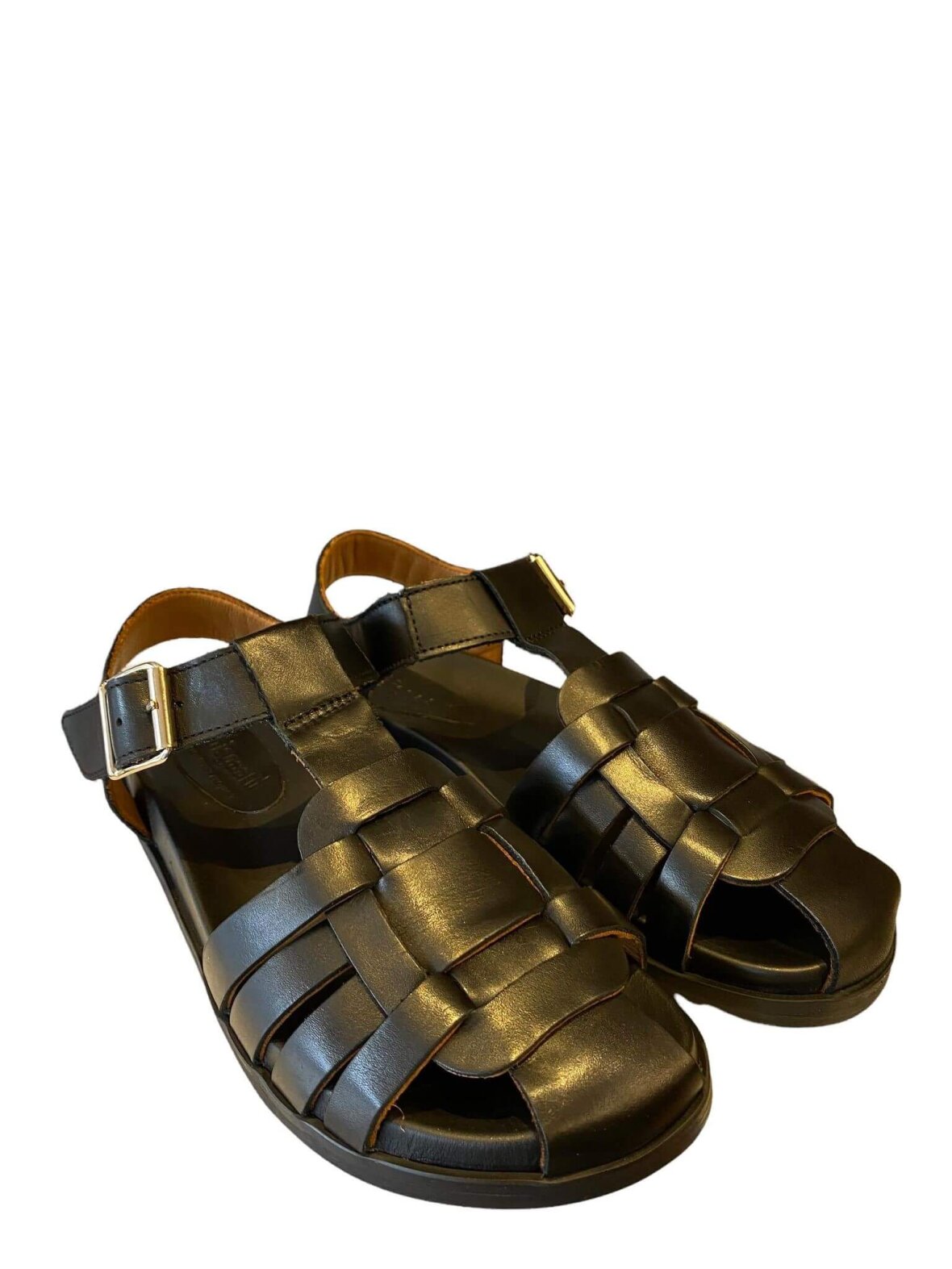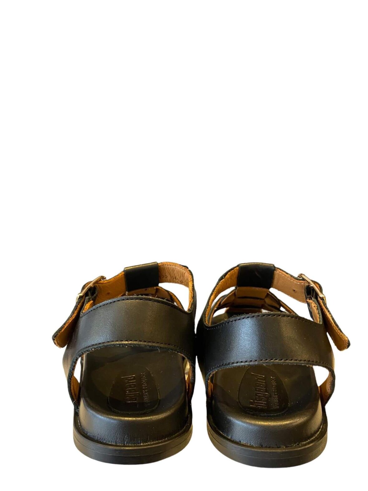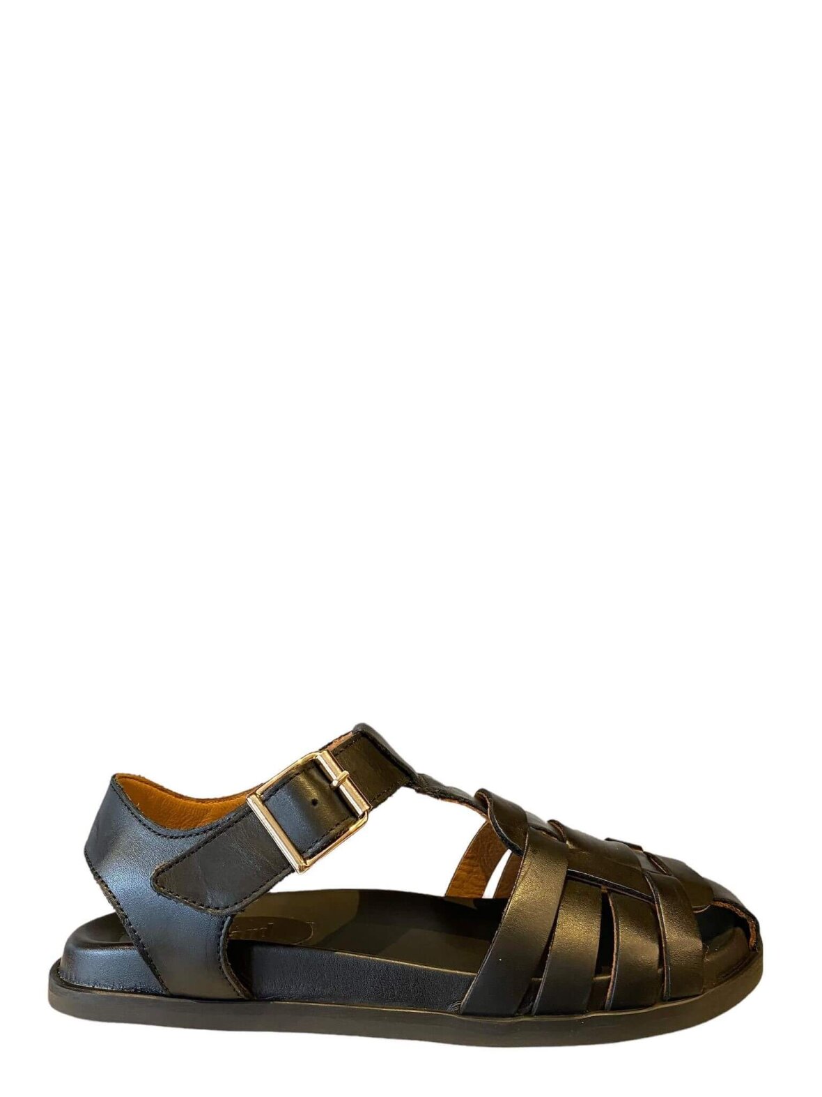 Sandal fra Bisgaard i sort anilin garvet skind. Flet over forfoden og lukket tå. Lukkes med spænde ved vristen.