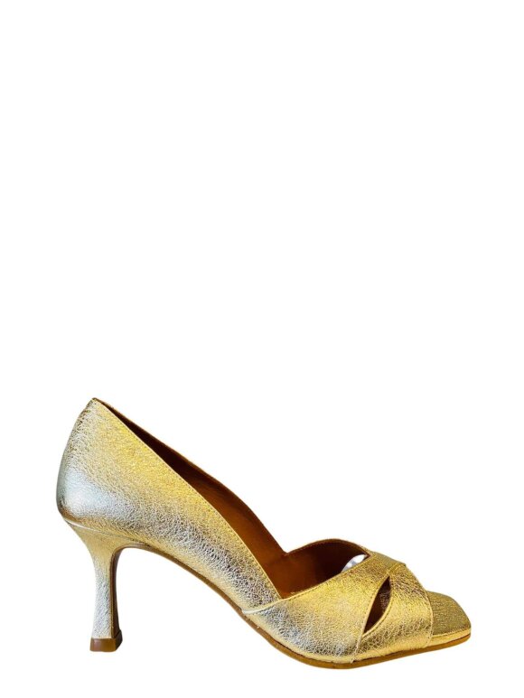 Smuk pumps fra Billi Bi i "gold crackele" skind, foret med skind. Kryds over forfoden - carré tå. Hælhøjde 7 cm