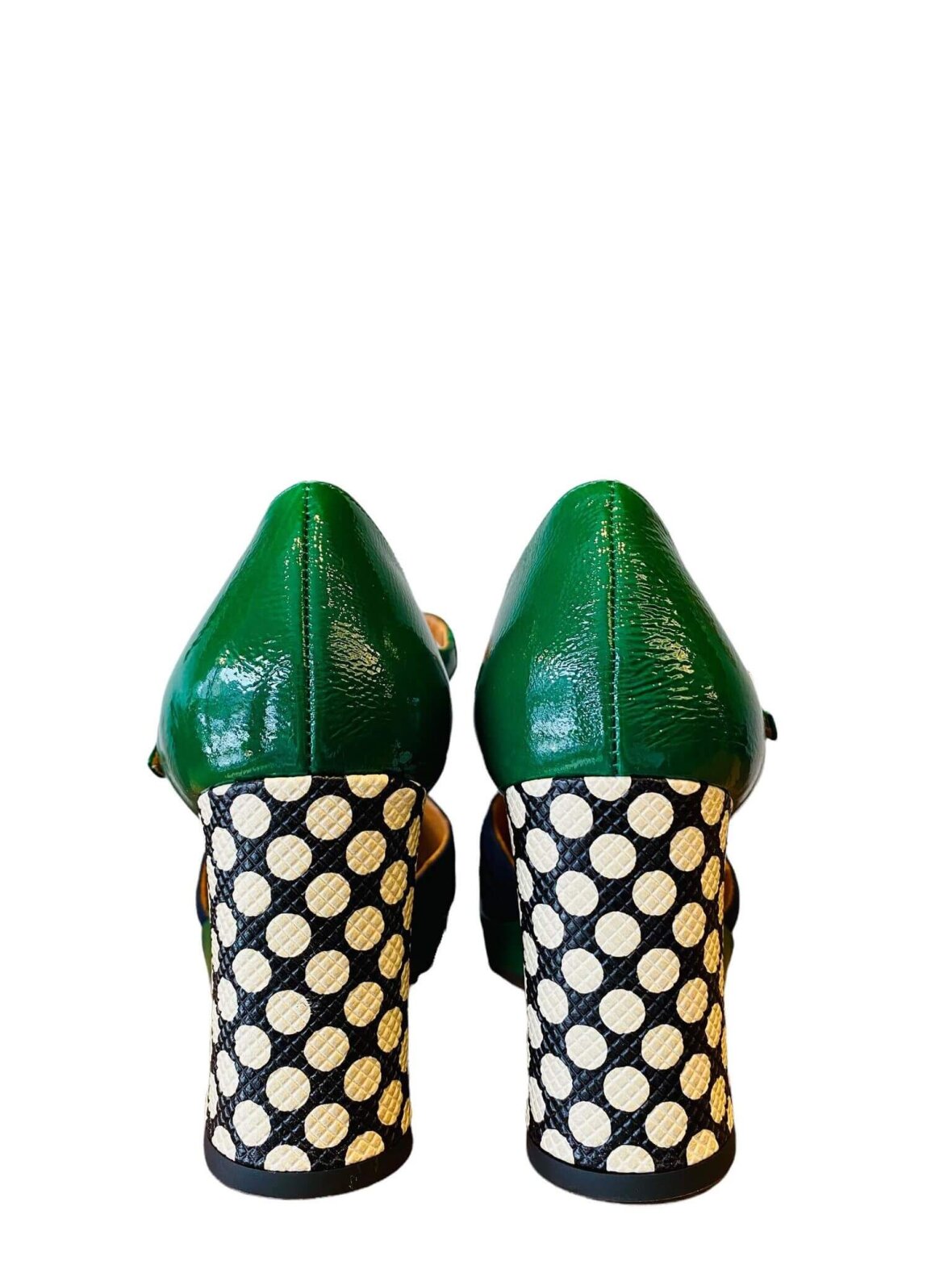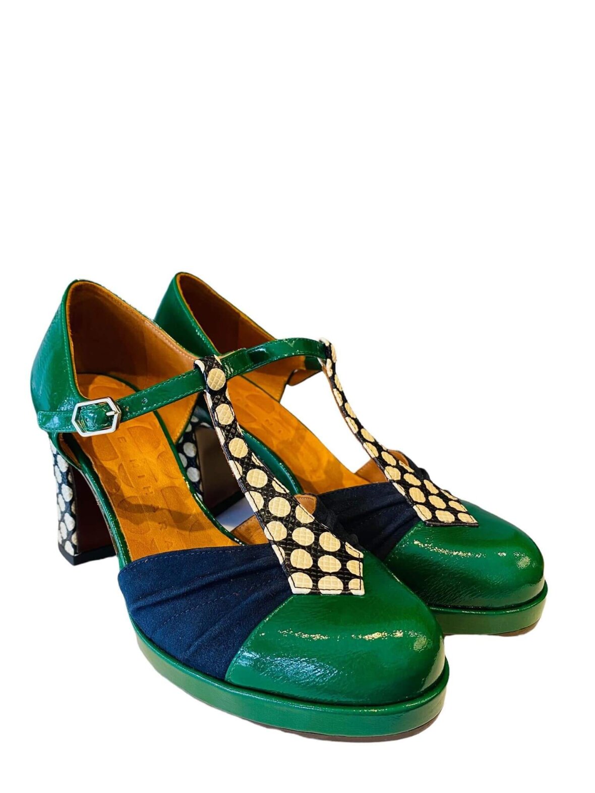 Smuk pumps med T-rem fra Chie Mihara i blå ruskind, grønt lak og præget skind. Foret med skind. Remmen over vristen lukkes med et lille spænde. Hælhøjde 8 cm og plateau foran 1,5 cm.