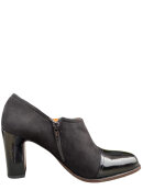 Smuk pumps fra Chie Mihara i sort ruskind samt sort lak på snude og hæl. Foret med skind. Lynlås på indersiden. Kraftig hæl med en højde på 8 cm.