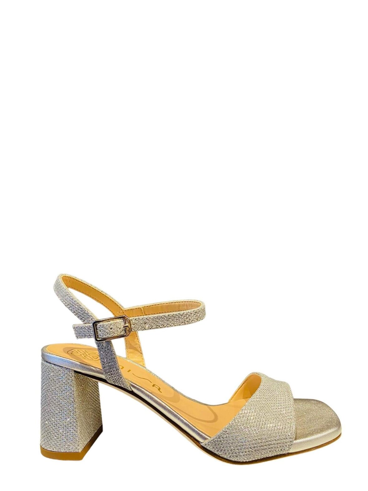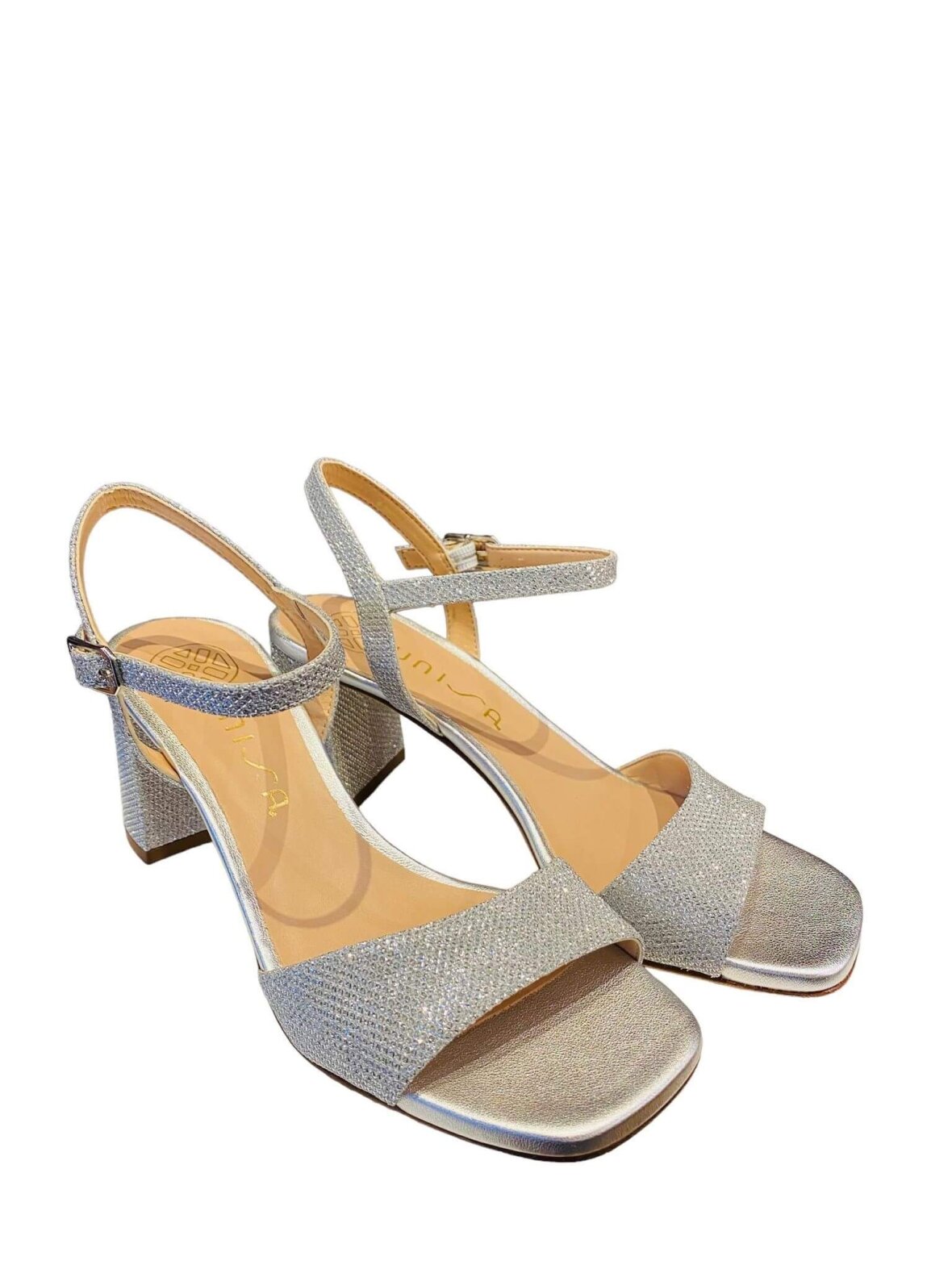 Smuk sandal fra UNISA i skinnende silver/sølv tekstil, foret med lyst skind. Tynde remme ved ankel der lukkes med lille spænde. Blokhæl med en højde på 7 cm - Carré tå