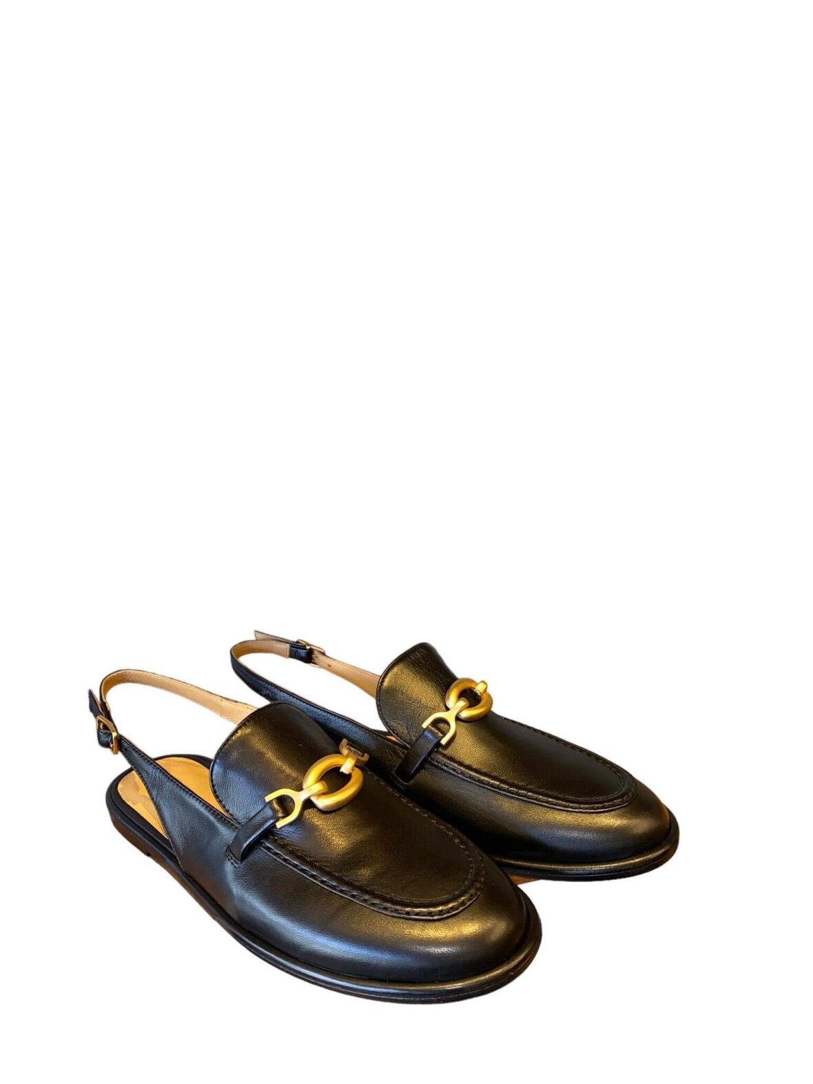 Smart sandal/loafers med slingback fra Pomme d'or i sort blødt skind, foret med skind. Dekorativ kæde på forfoden i mat "guld". Hæl remmen kan justeres med et lille spænde.