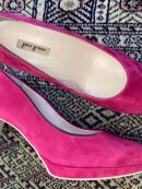 Klassisk Paul Green pumps i pink ruskind med skind foer. Skoen har svangstøtte og er stor i størrelsen. Vi anbefaler at gå et halvt til et helt nummer ned i forhold til din normale str. Hælhøjde: 8,5 cm hæl og 1 cm plateau. God pasform. En pumps du vil kunne danse i hele natten.