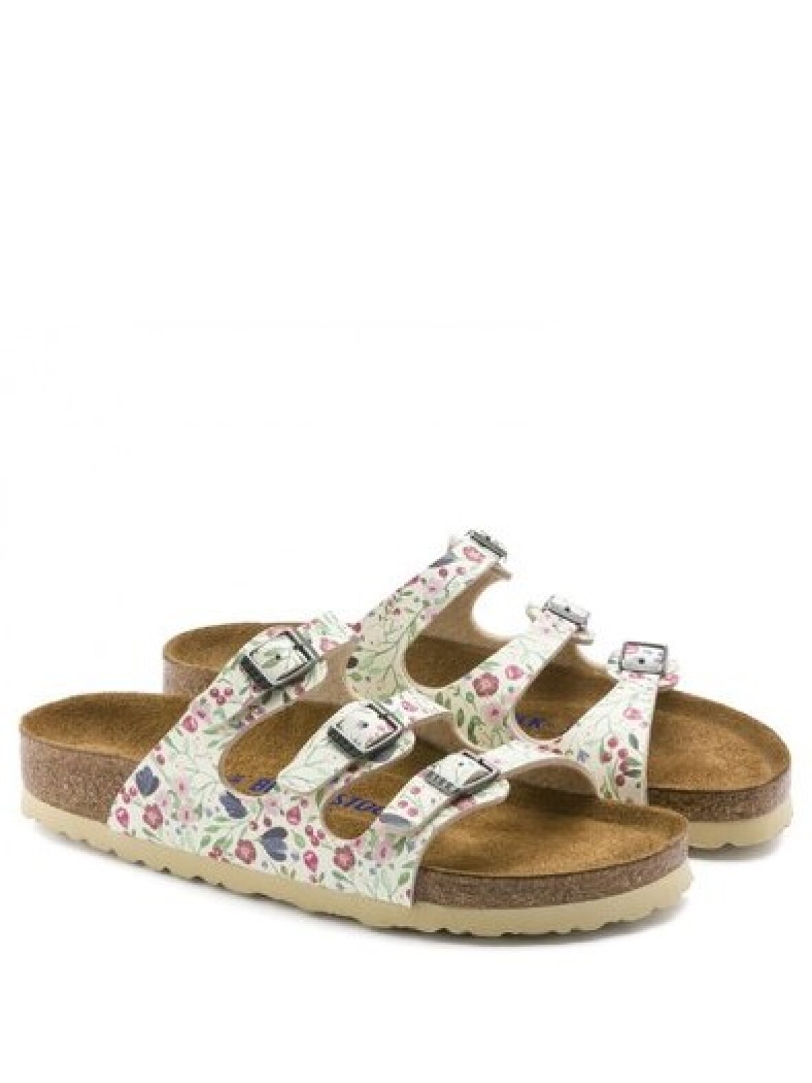 Birkenstock Florida sandal i birko-flor. Blød fodseng. Bundfarve beige med blomstret mønster/Meadow Flowers Beige. Tre stropper, hver med et individuelt justerbart metalspændespænde. Bredde: Narrow