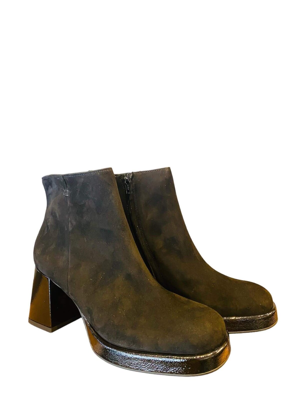Flot kort støvle fra Paul Green i sort ruskind, foret med skind. Lynlås på indersiden. Blokhæl i lak på 7,5 cm - plateau i lak foran på 1,5 cm