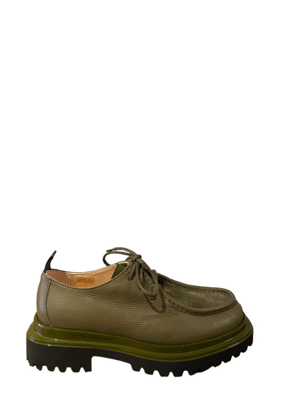 Super flot sko med snøre fra L'ECOLOGICA i forest/grøn skind, foret med skind. Sort sål.