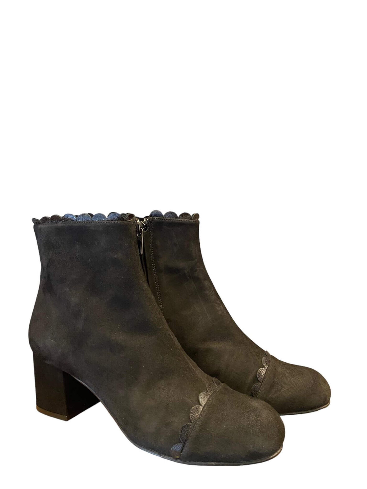 Kort støvle fra AUDLEy i sort ruskind, foret med skind. Hælhøjde 6 cm. Lynlås på indersiden.