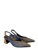 Flot slingback fra Högl i mørk blå demin, foret med skind. Smuk sølv farvet hæl med en højde på 5,5 cm. Justerbar hælrem med lille "sølv" spænde.