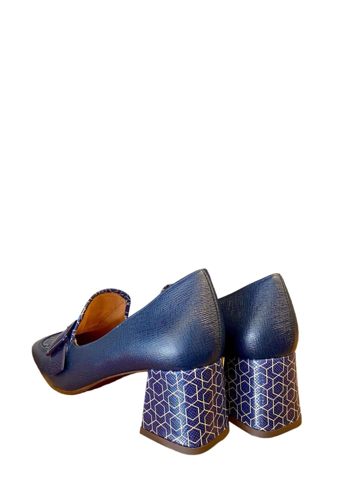 Smuk sko fra Chie Mihara i navy skind. Samt præget skind på hælen og forblad. Lak rem over forblad. Foret med skind. Blokhæl med en højde på 5 cm