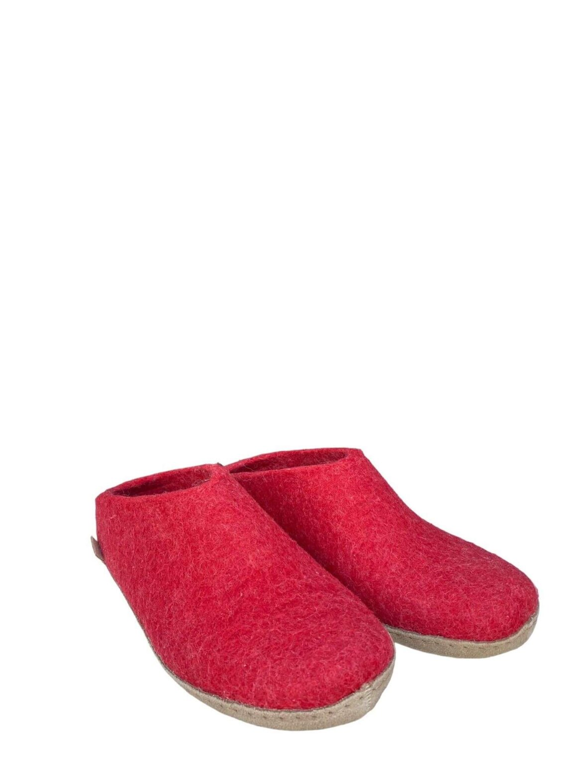 Filttøffel af 100% ren naturlig rød uld med en sål af semi-vegetabilsk garvet kalveskind. Hjemmeskoens pasform følger fodens konturer og søger for, at den forbliver på foden. Skoen er smidig, og uldens egenskab til at optage fugt bevirker, at fødderne altid føles varme og tørre.