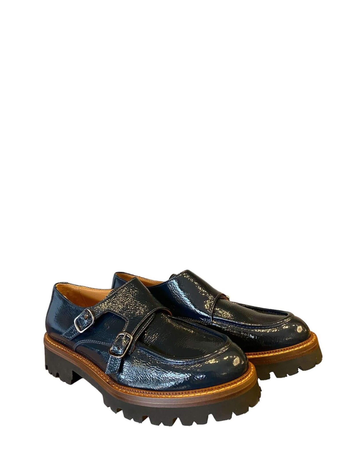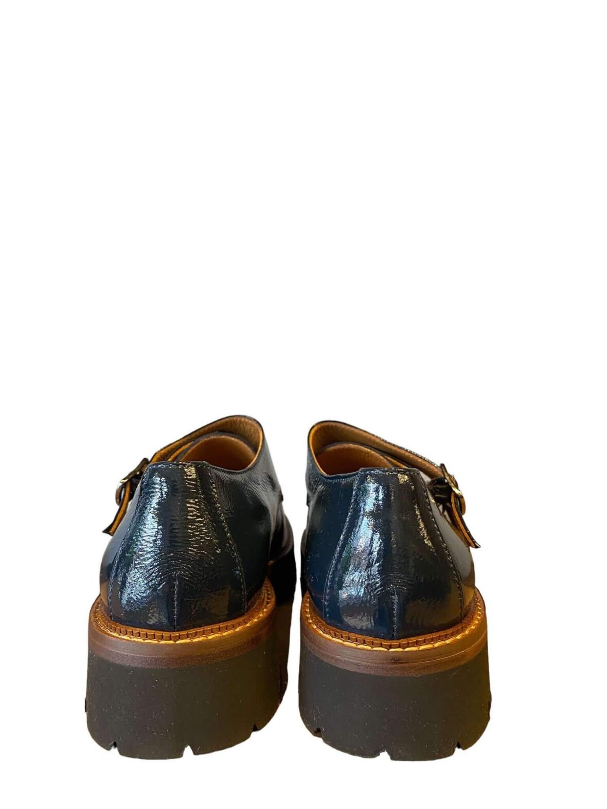 Loafer fra MAT:20 i tmørk blå krøl lak, foret med skind. 2 små smarte spænder over forfoden. Hælhøjde 3,5 cm og plateau for 2 cm.