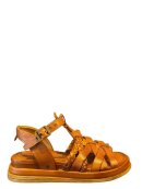 Flot sandal fra A.S. 98 i brun skind, foret med skind. Hånd flettede remme over foden. Lukkes med et spænde ved vristen.