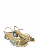 Smuk sandal fra Paul Green i sølv farvet skind, foret med skind. Fine smalle remme - lukkes med et lille spænde. Blokhæl med en højde på 6 cm