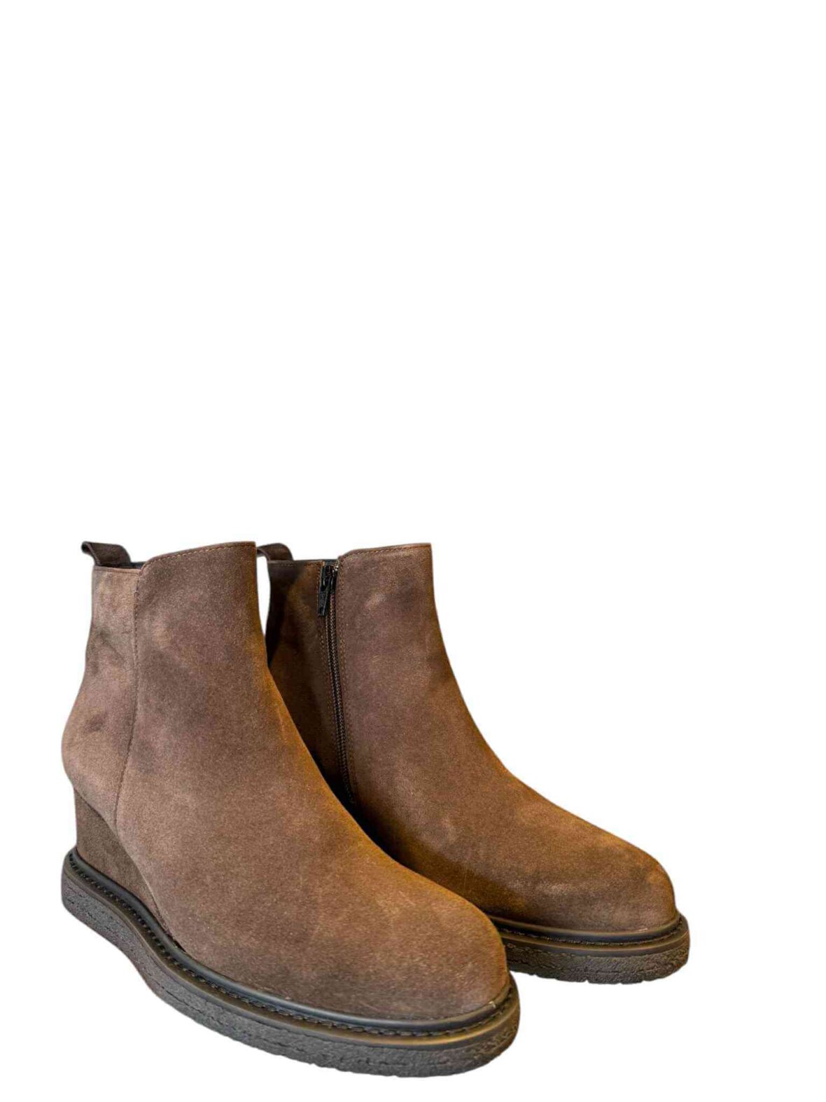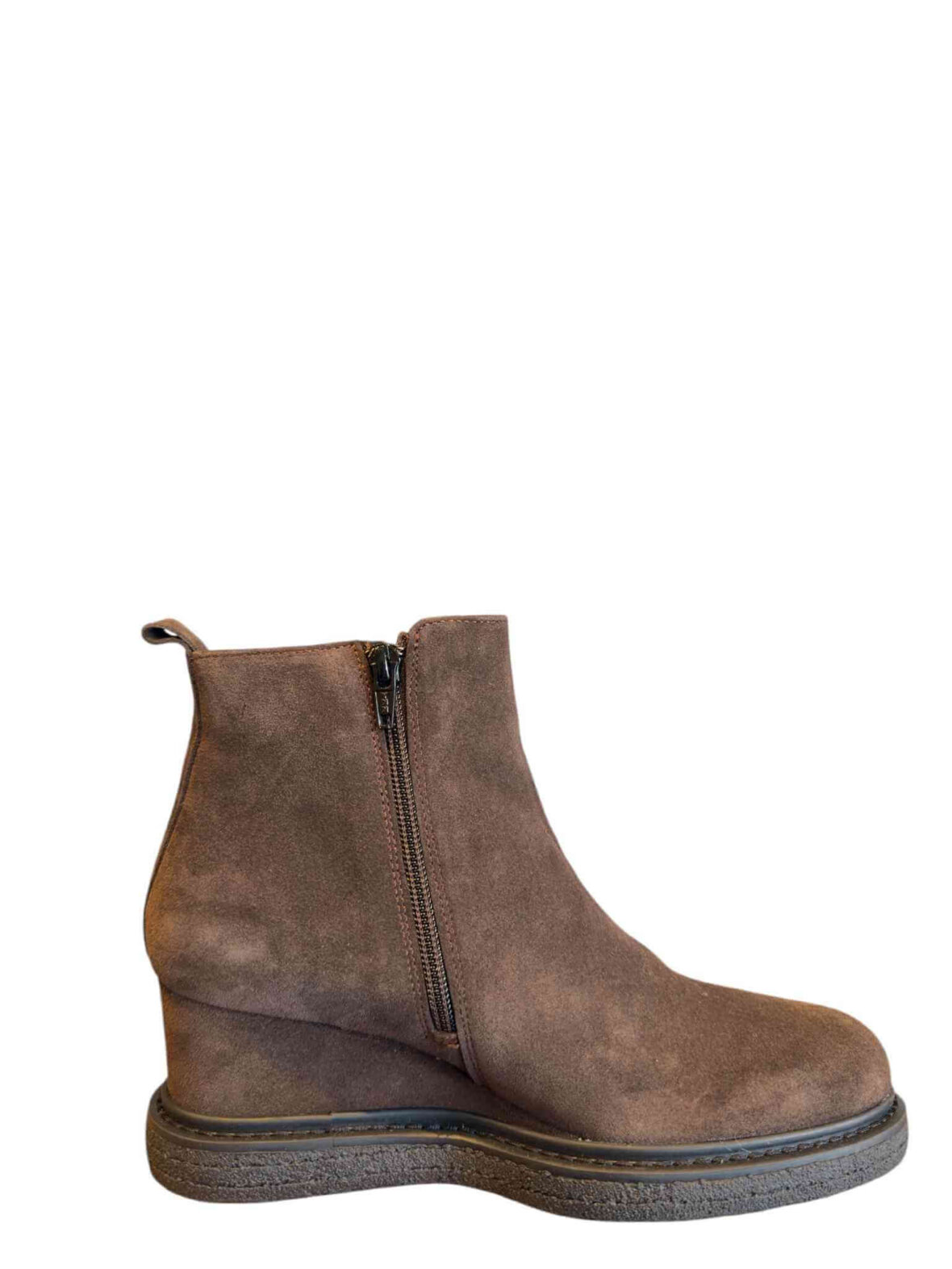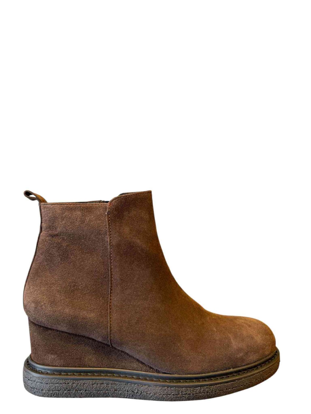Kort støvle med kilehæl fra LBDK i brunt ruskind, foret med skind. Hælhøjde 6 cm