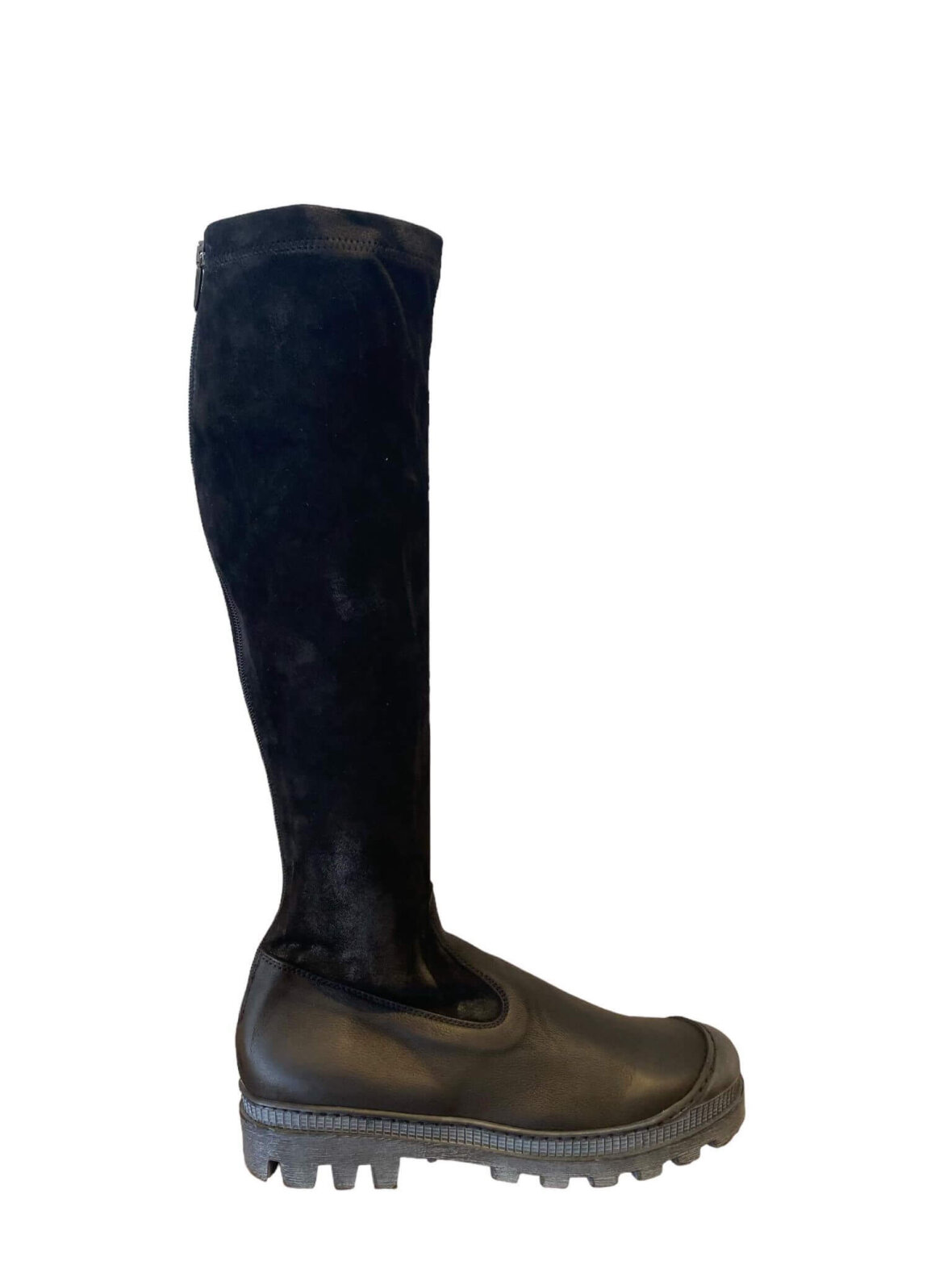 Smart lang støvle fra Lofina i sort skind, skaftet er i stretch ruskind. Lynlås bag på.