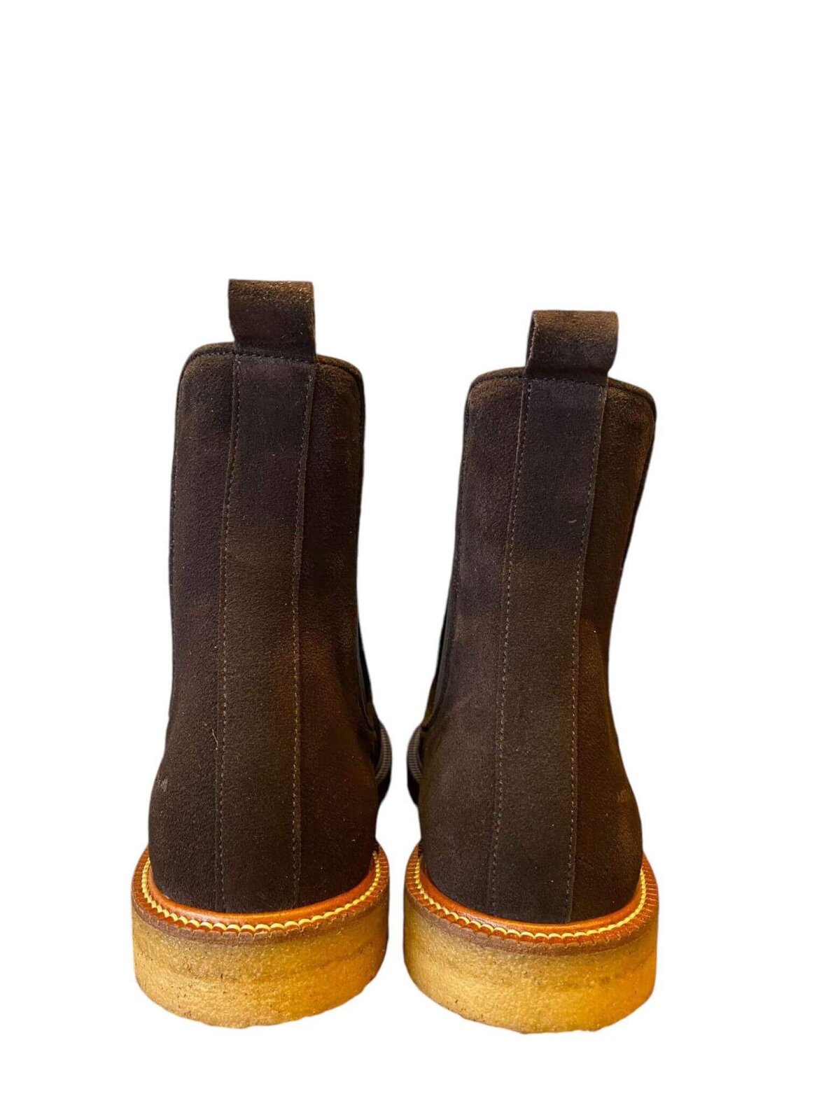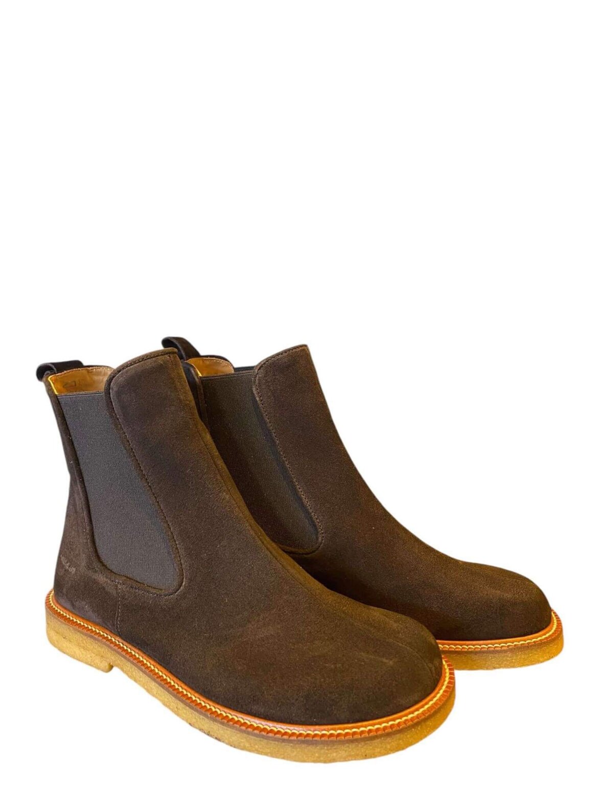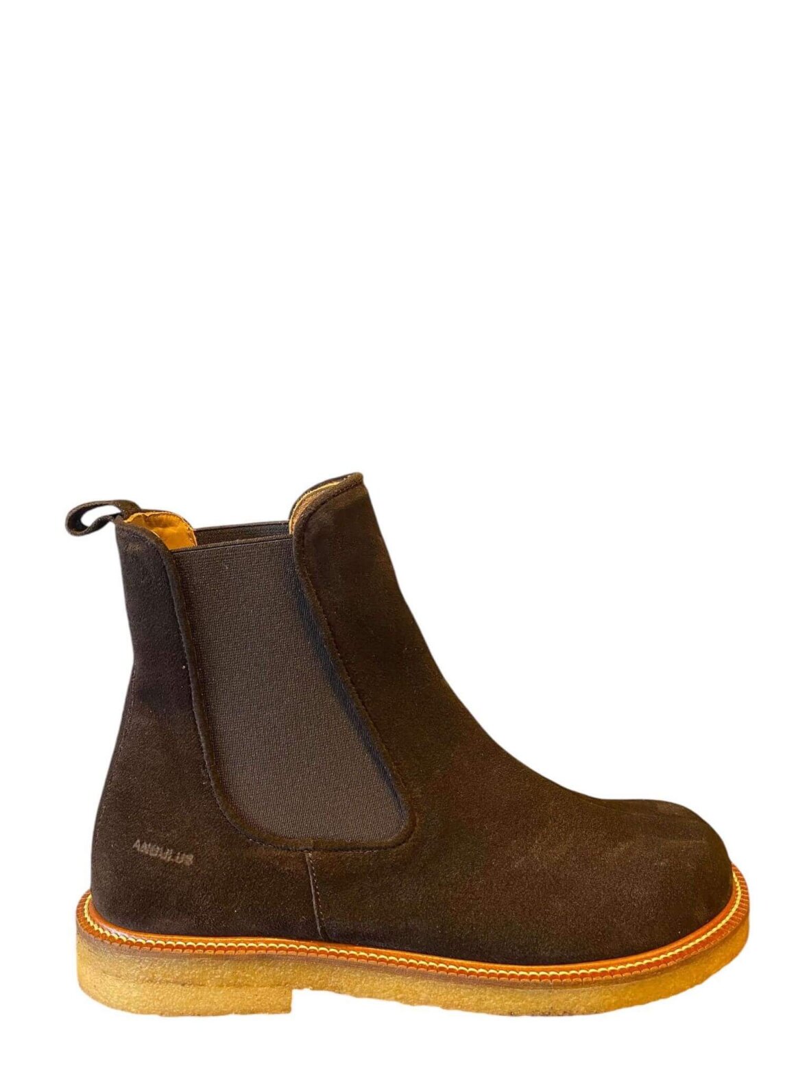 Chelsea boot fra Angulus i brun ruskind, foret med skind. Rågummi sål. Bred læst.