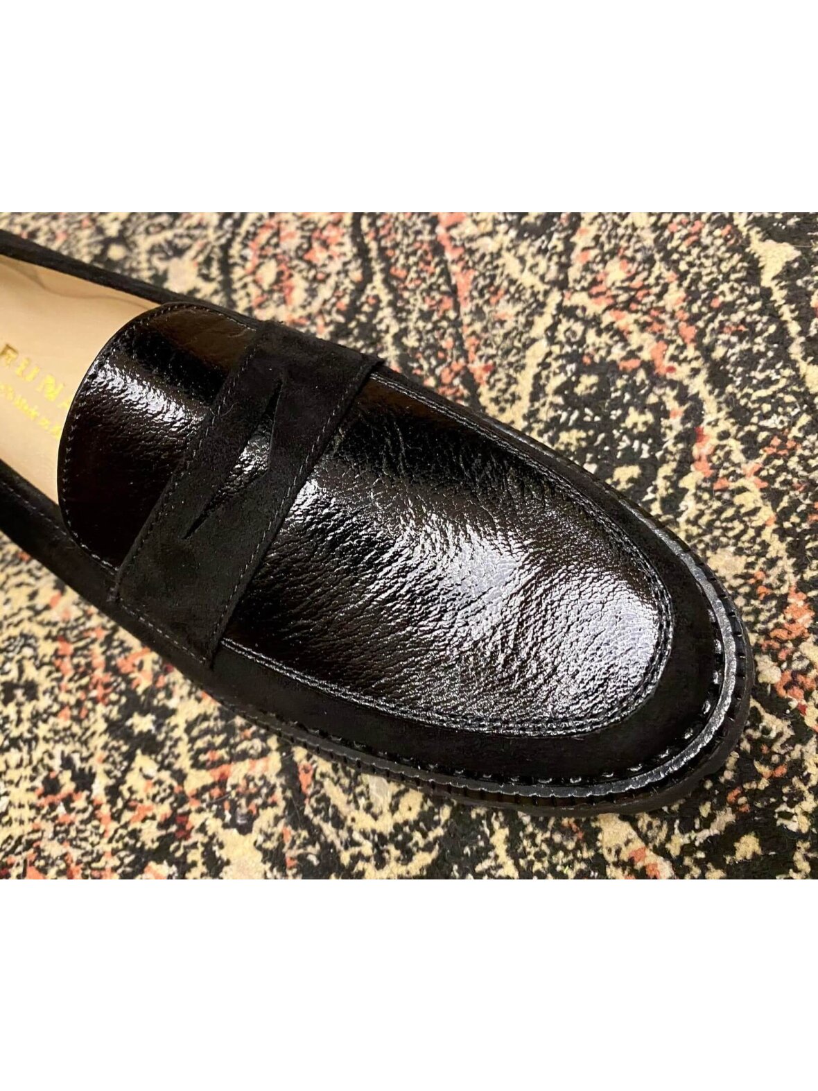 Loafers fra Brunate i sort ruskind, foret med skind. Dekorativt bånd i ruskind over foden, samt lak på forfoden. Sort kraftig sål