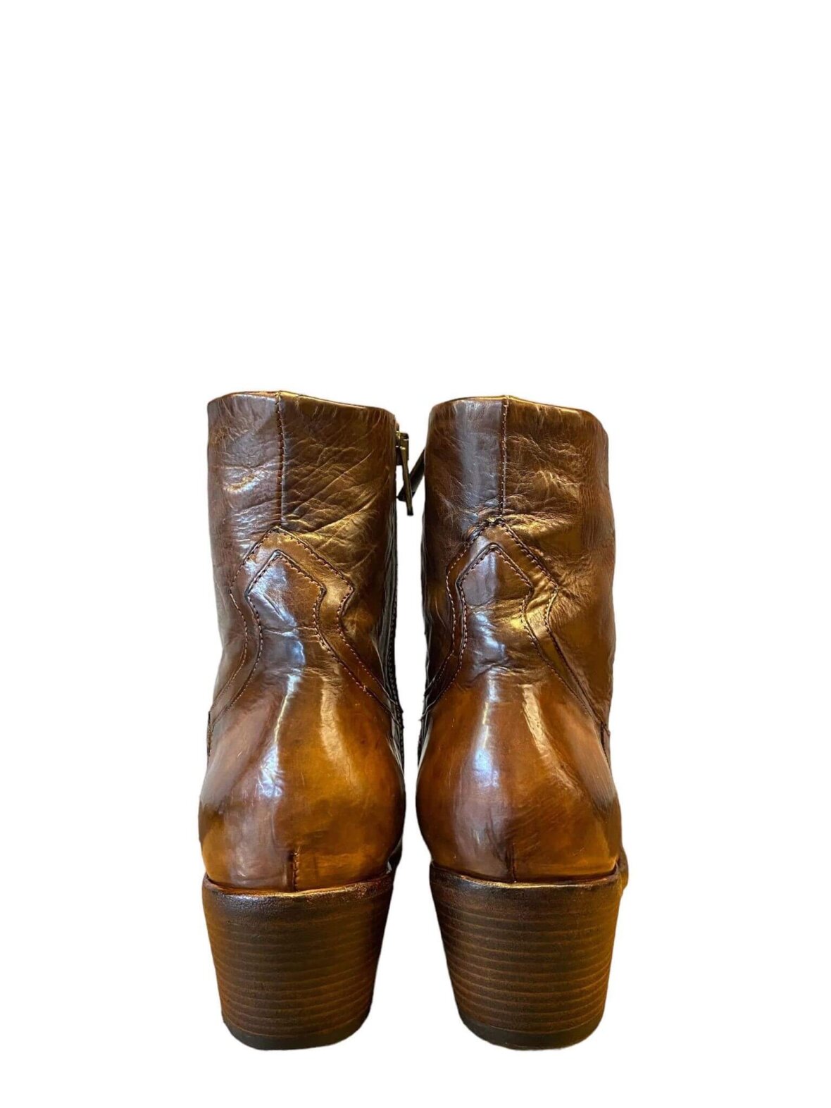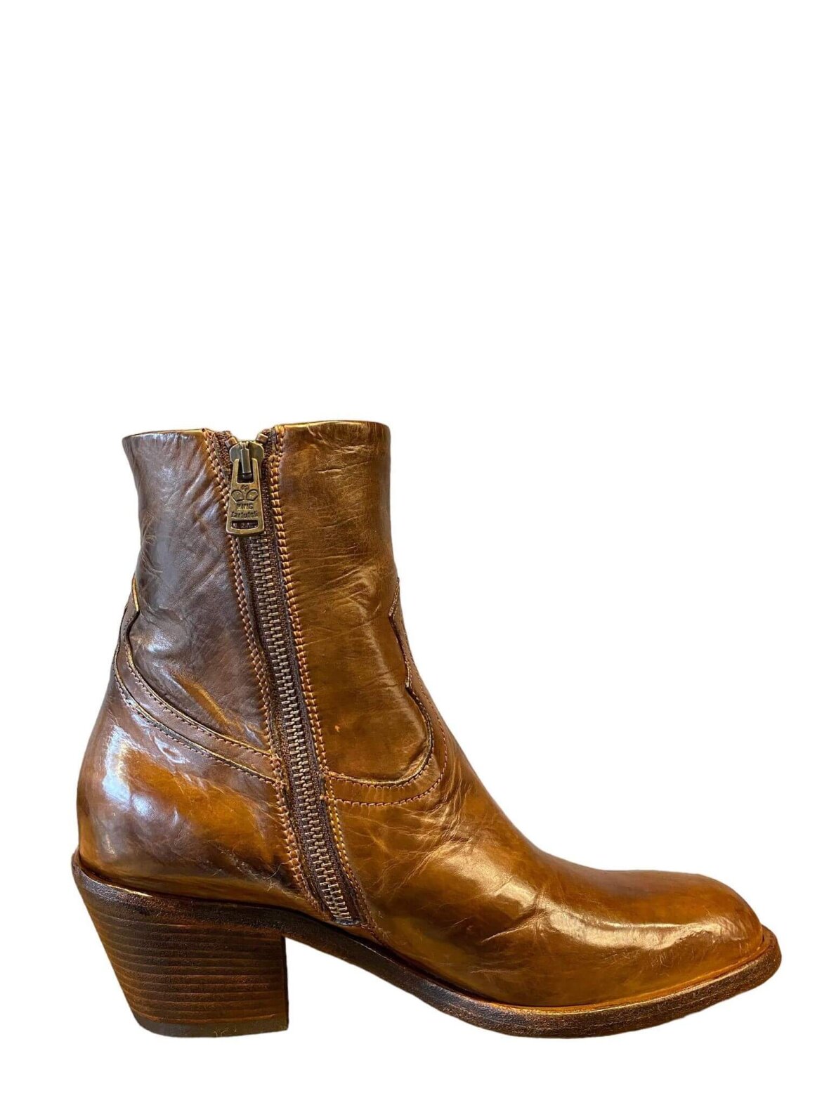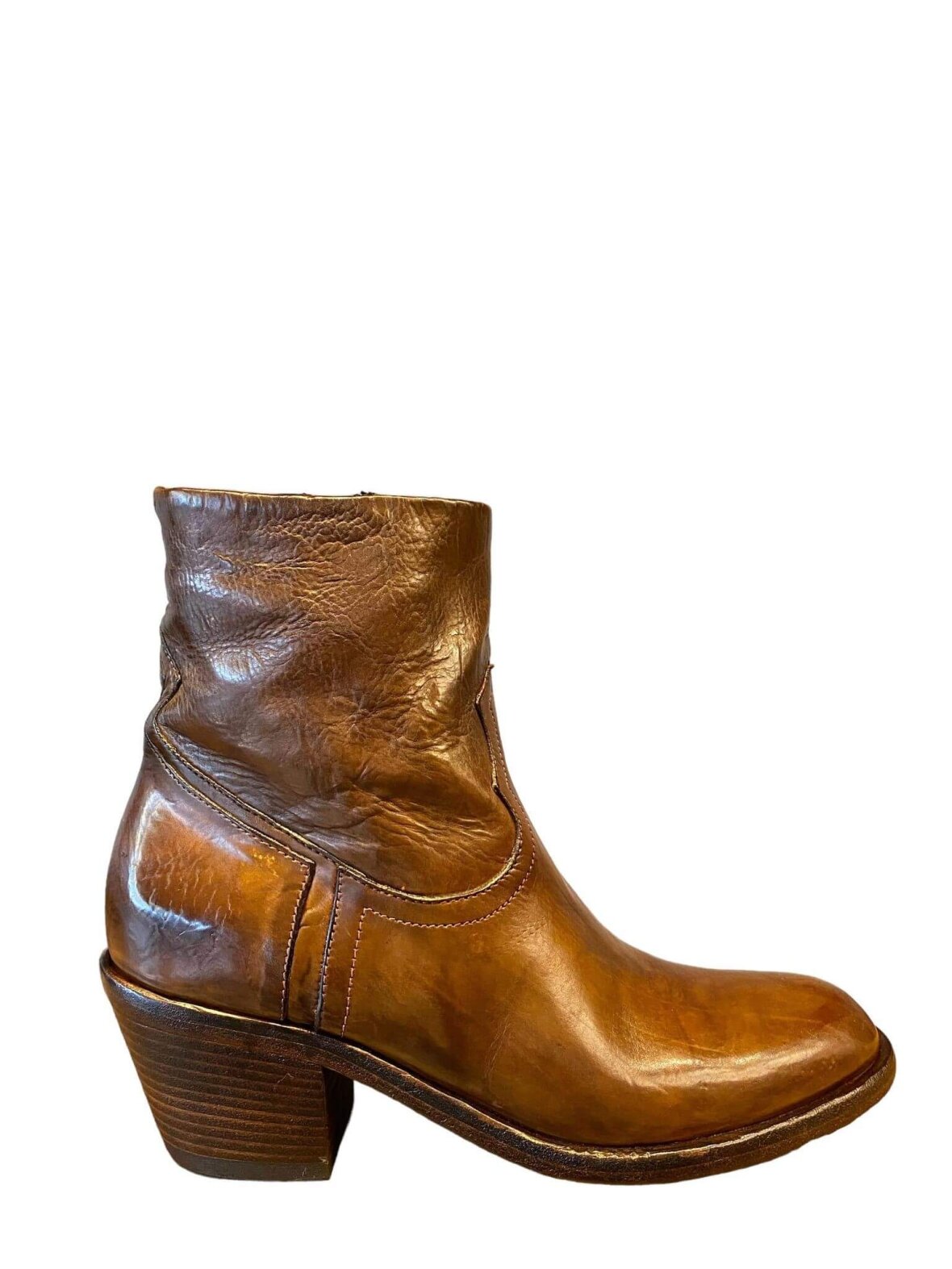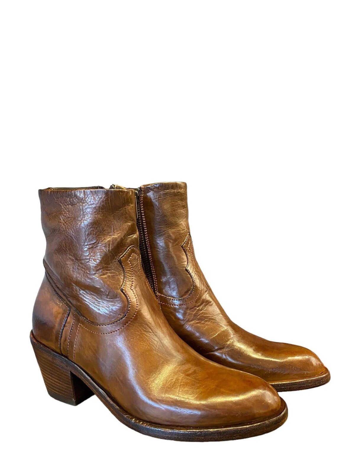 Itailienske håndlavede korte støvler fra King i cognac farvet skind, foret med skind. Lynlås på indersiden. Hælhøjde 6,5 cm