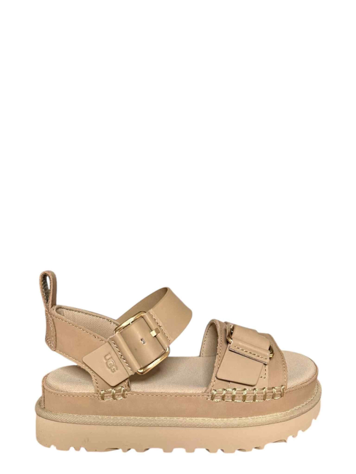 Super flot sandal fra UGG i skind - farve: mustard. Lukkes ved vristen med spænde. Kraftig sål med en højde bagtil på 4,5 cm og fortil på 3 cm.