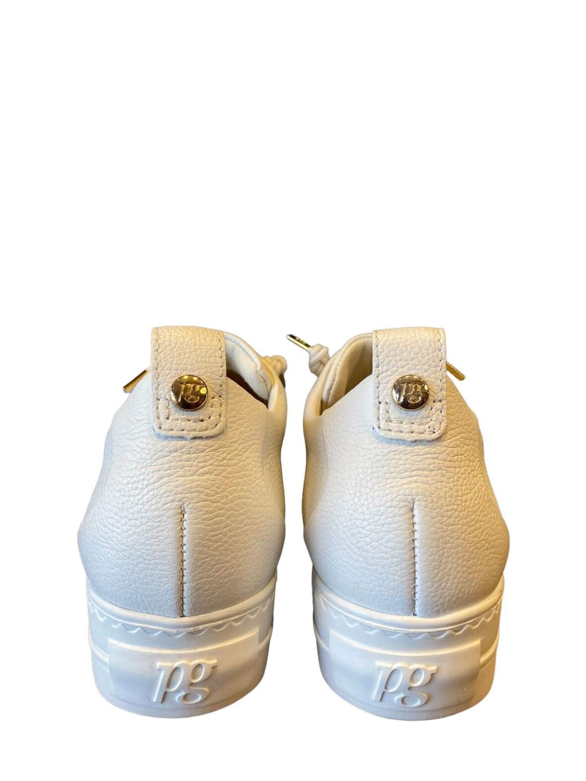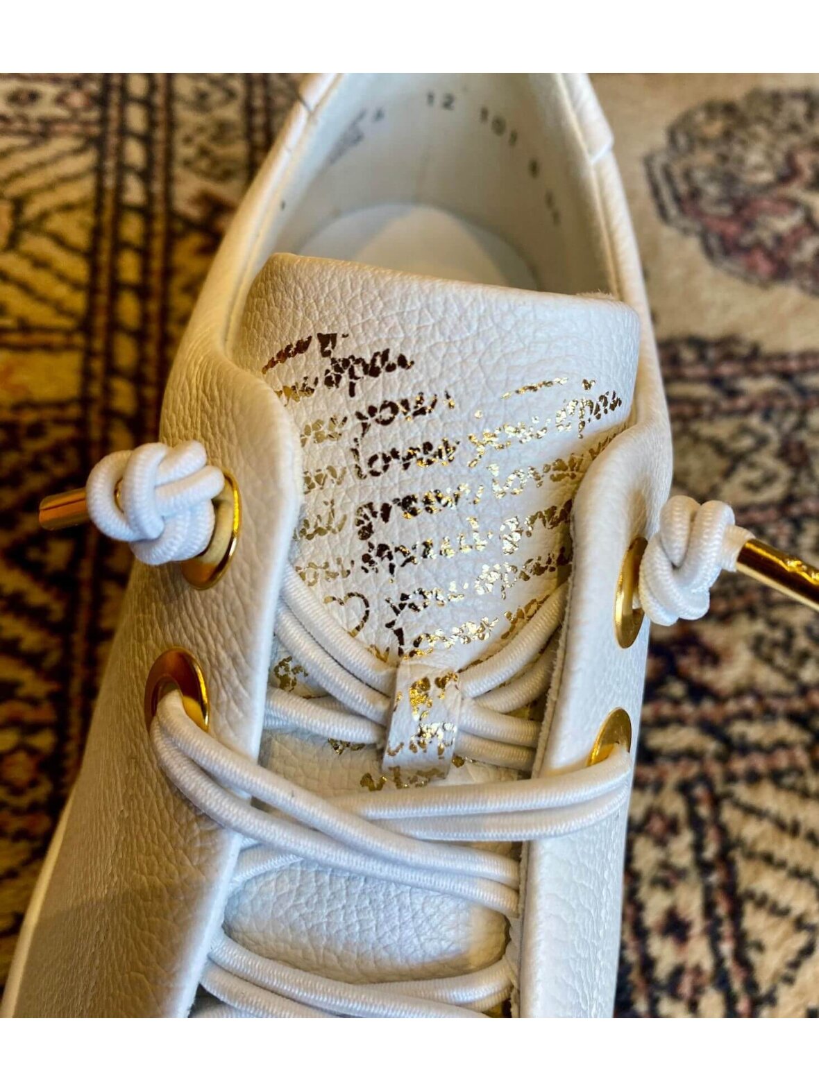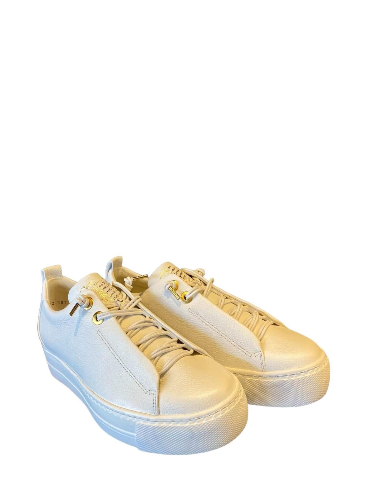 Klassisk sneakers i hvid skind, elastik snøre og guld snørehuller. Skoen har skind foer og skindsål med svangstøtte.