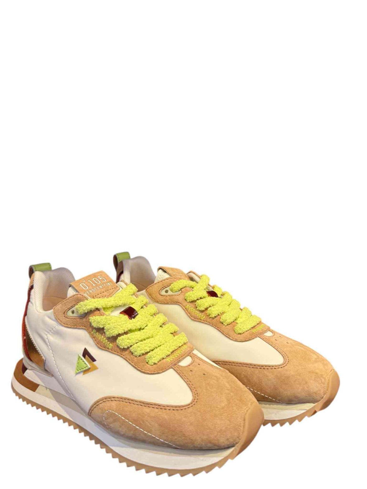 Super smart sneakers LENOX TAN fra 0^105 i blandede materialer, tekstil-ruskind-skind, samt et mix af farver. Aftagelig fodseng. Lig specielt mærke til den flerfarvede sål.