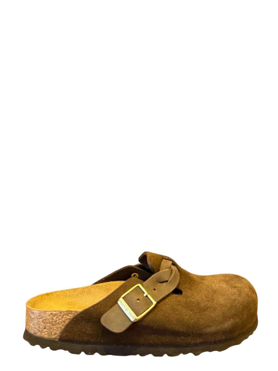 Boston Braided fra Birkenstock i ruskind i farven Carafe/brun. Flettet skind rem over vristen. Bredde: Narrow