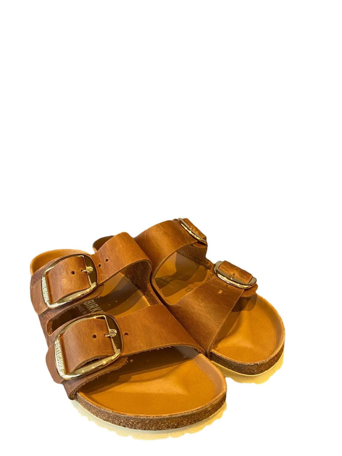 Birkenstock sandal - Arizona Big Buckle i cognac farvet olieret skind, med dekorative dornspænder i "guld". Anatomisk formet kork-latex-fodseng der er betrukket med blødt glat skind i matchende farve. Vidde: Narrow Fit