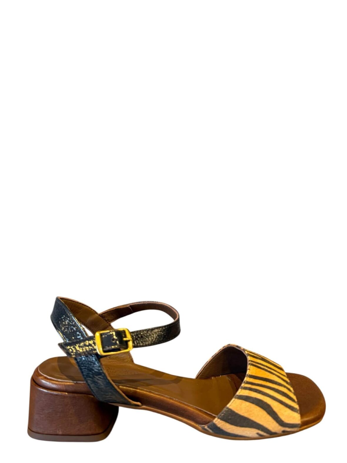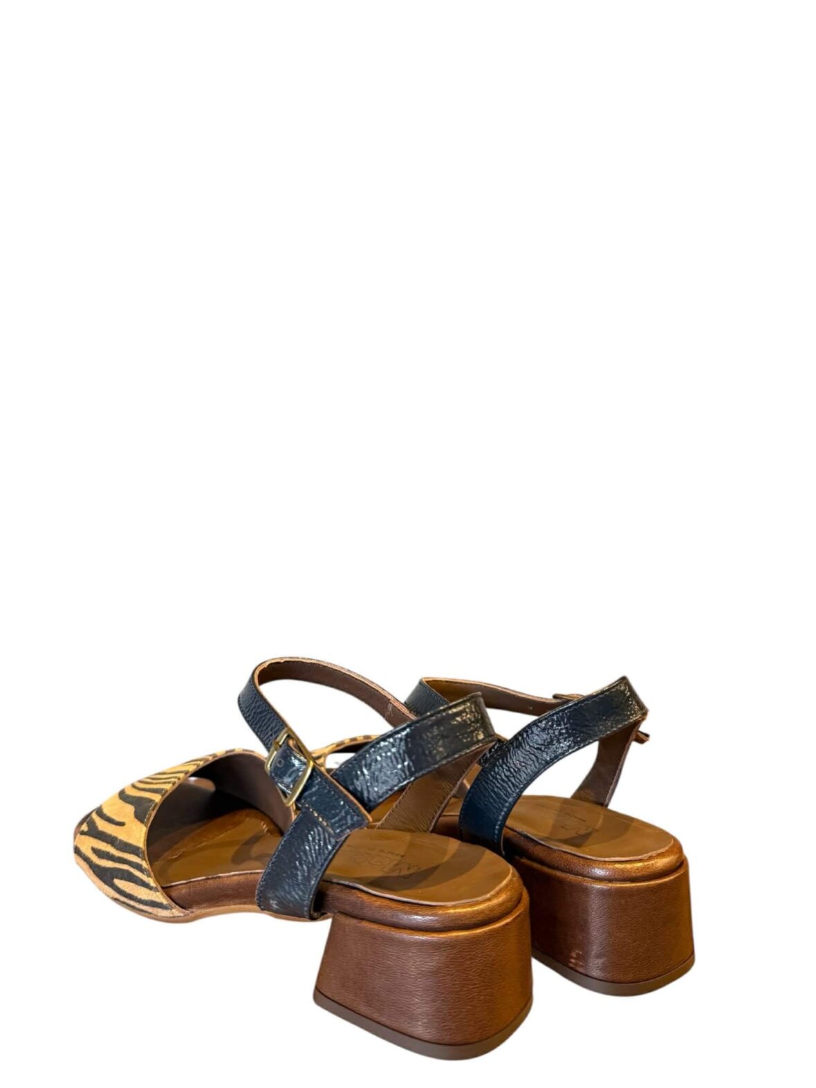 Smuk sandal fra MAT:20 i zebra over forfoden, og blå lak på remme. Lukkes med et spænde ved anklen. Foret med skind. Hælhøjde 4 cm.