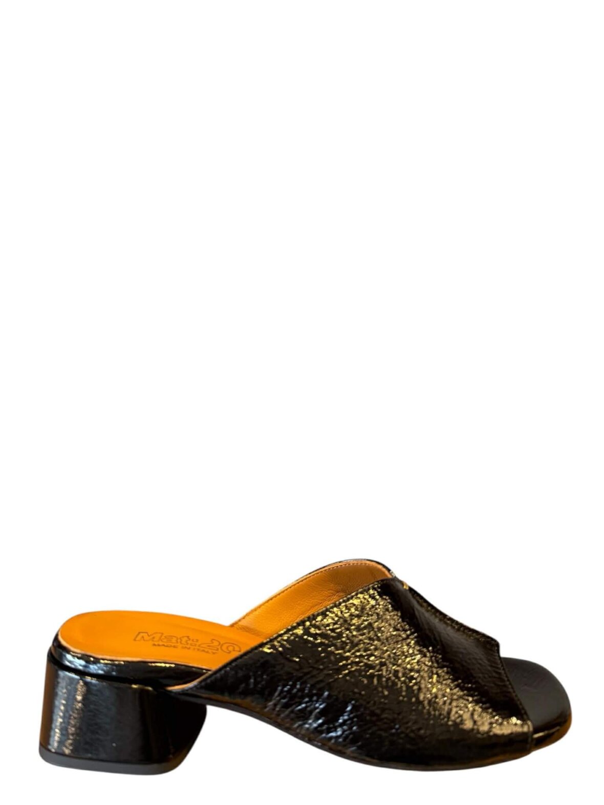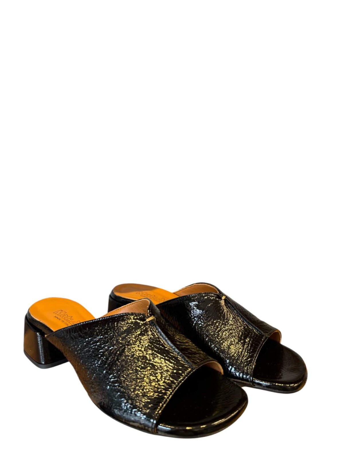 Smart sandal i sort krøl lak, foret med skind. Hælhøjde 4,5 cm.