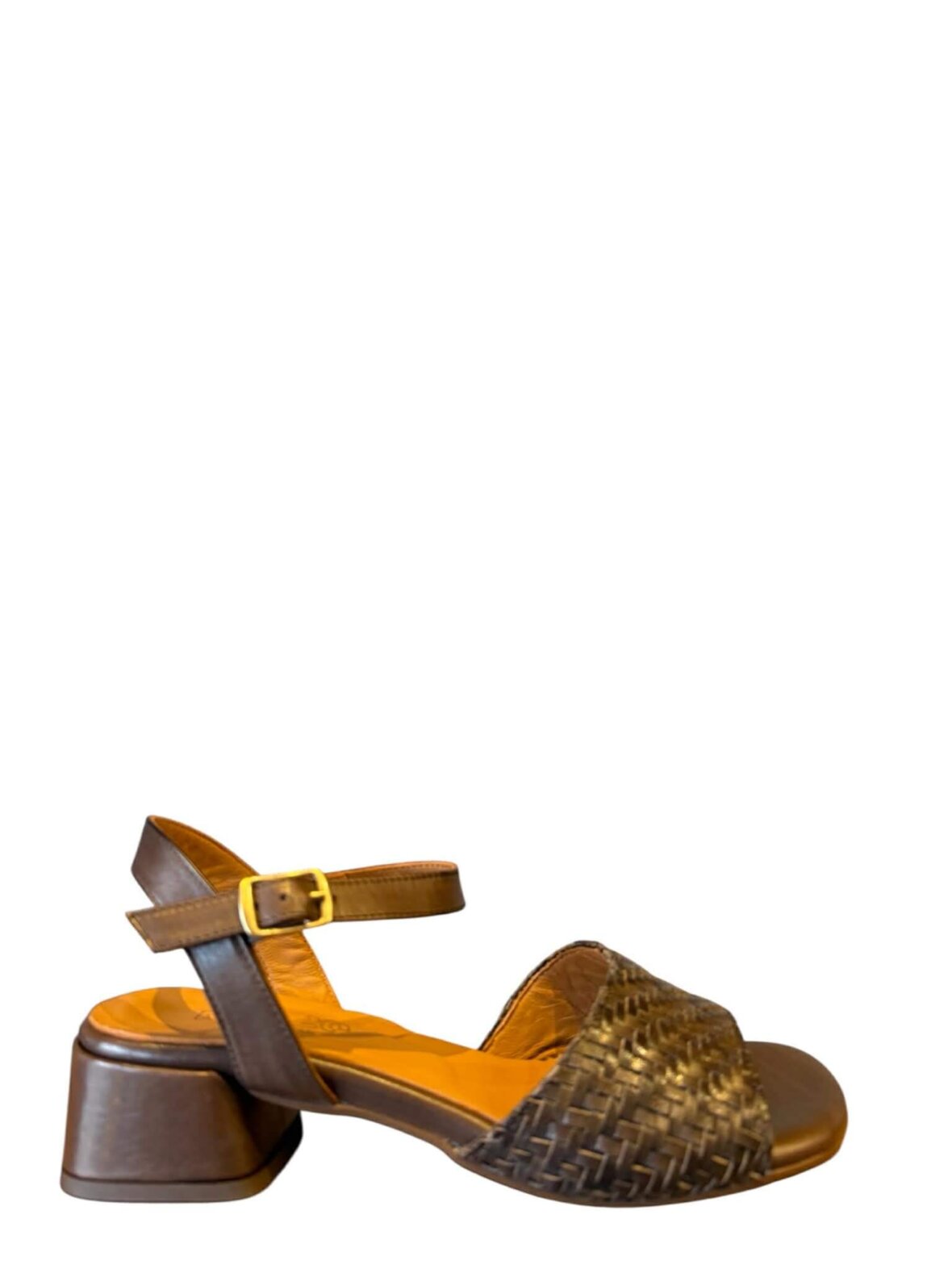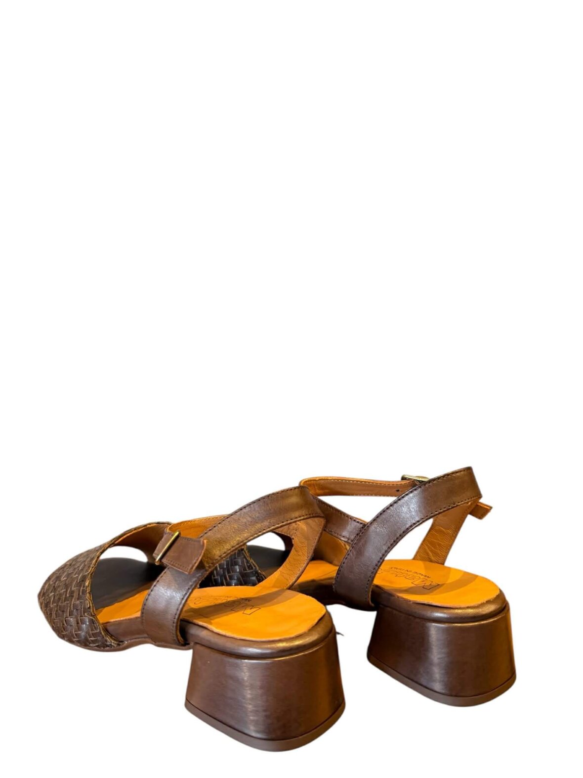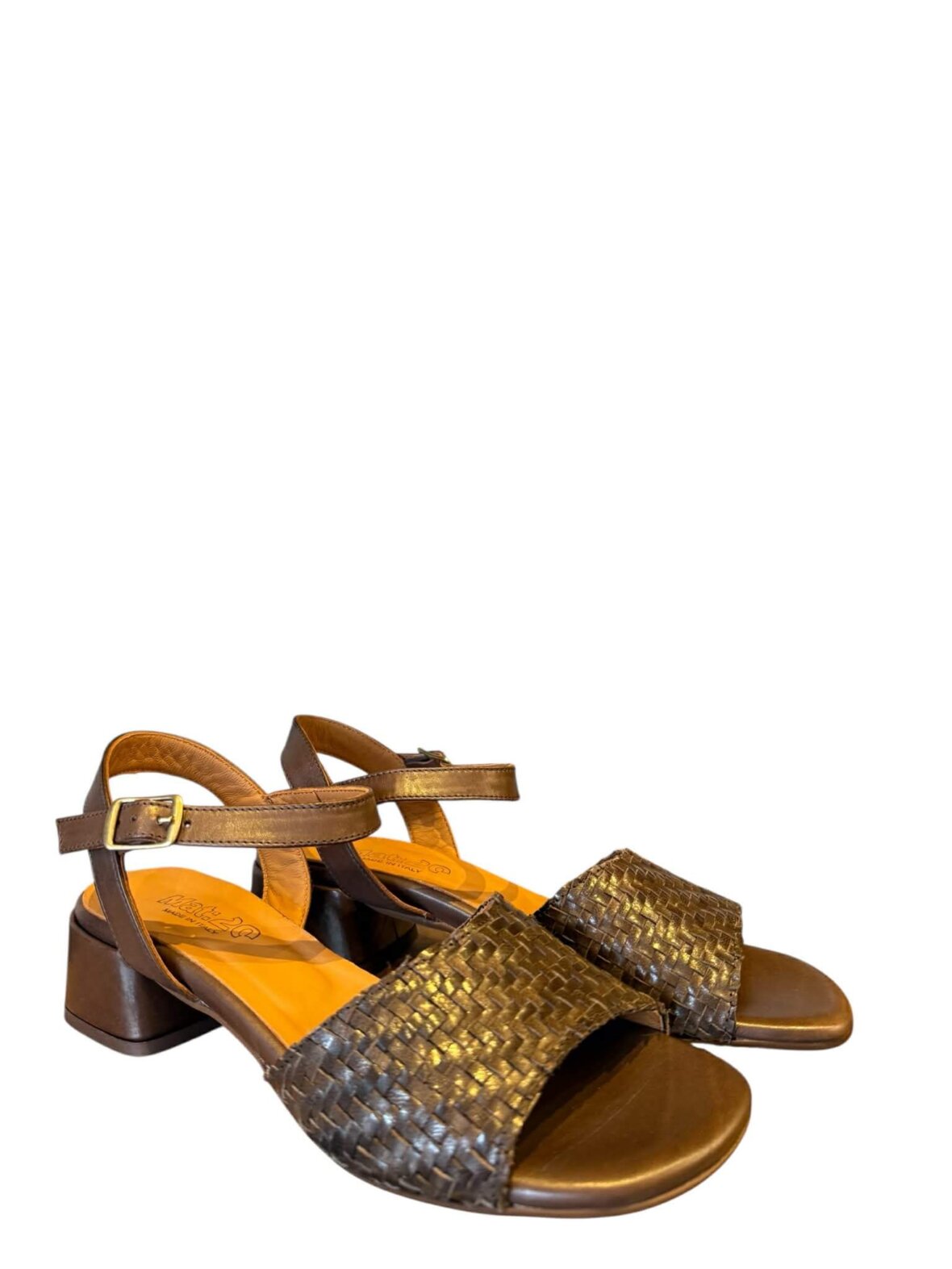 Smuk sandal fra MAT:20 i brunt skind, med flet over forfoden. Lukkes med et spænde ved anklen. Foret med skind. Hælhøjde 4 cm.