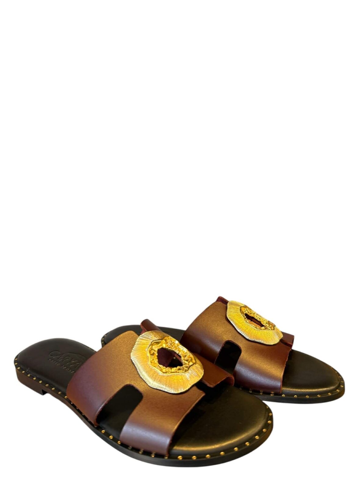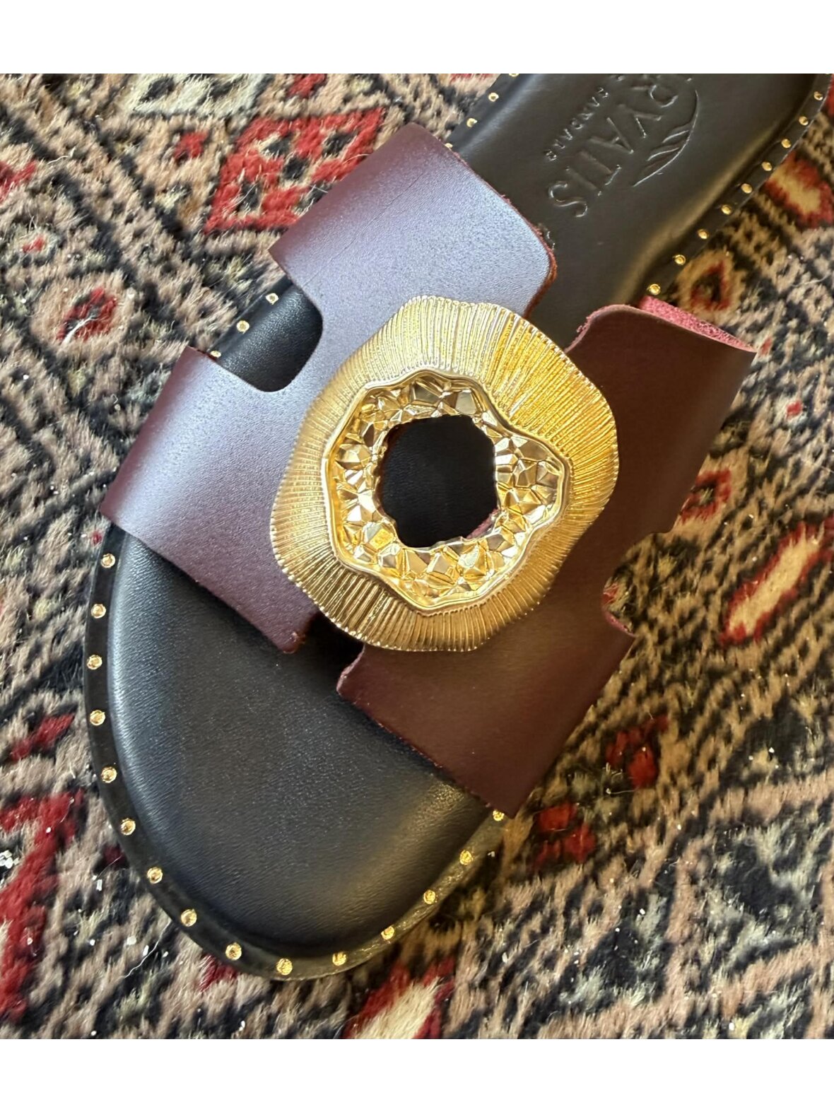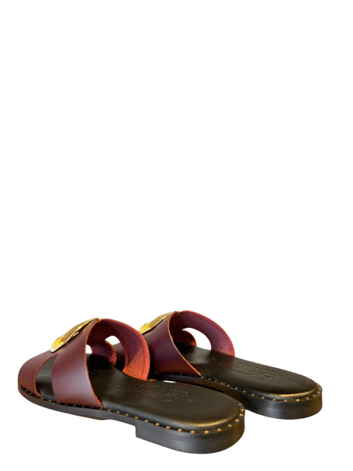 Smuk sandal fra Caryatis i boredeaux skind, med blød komfort. Dekorativ guld ring over foden.