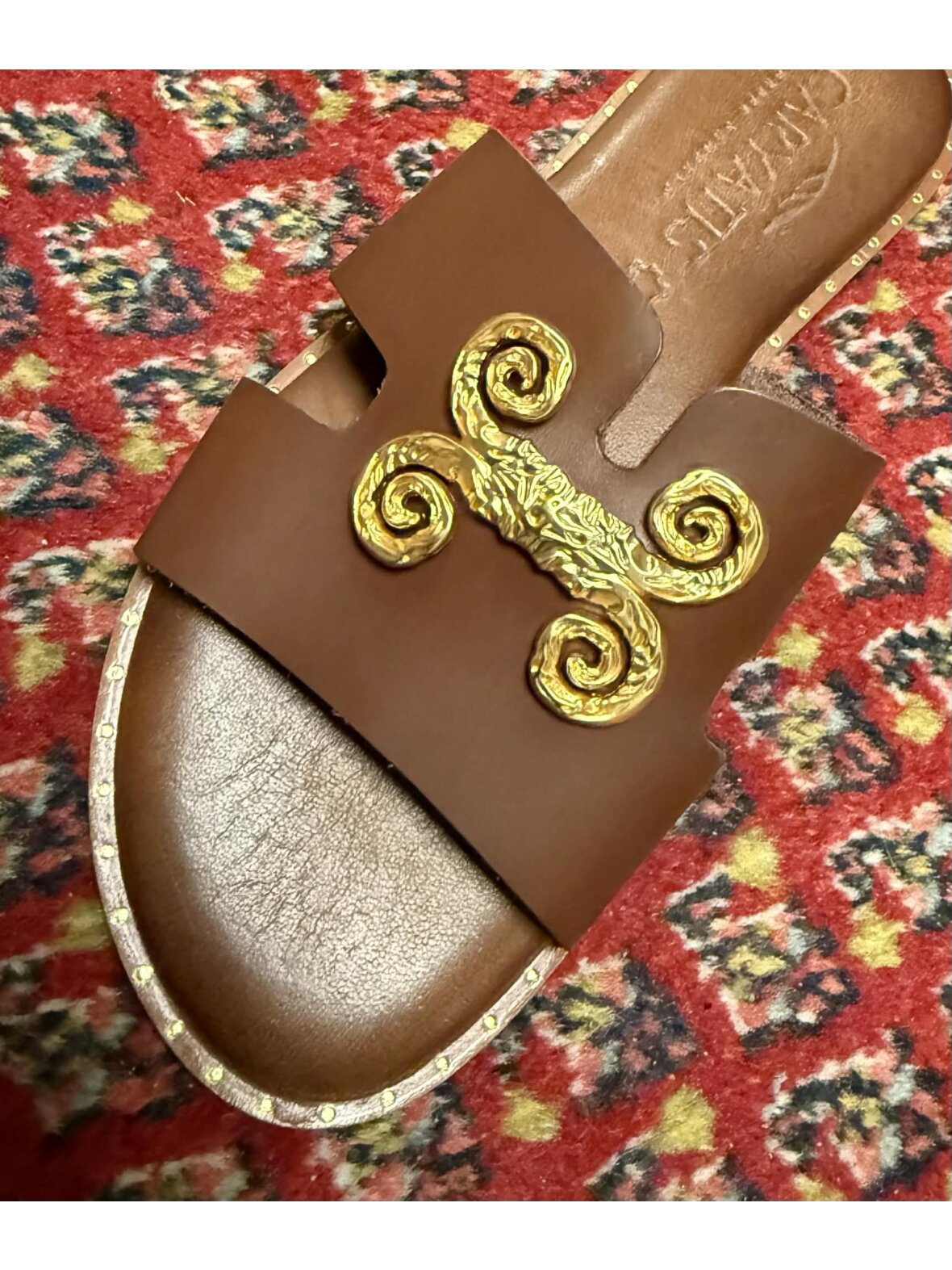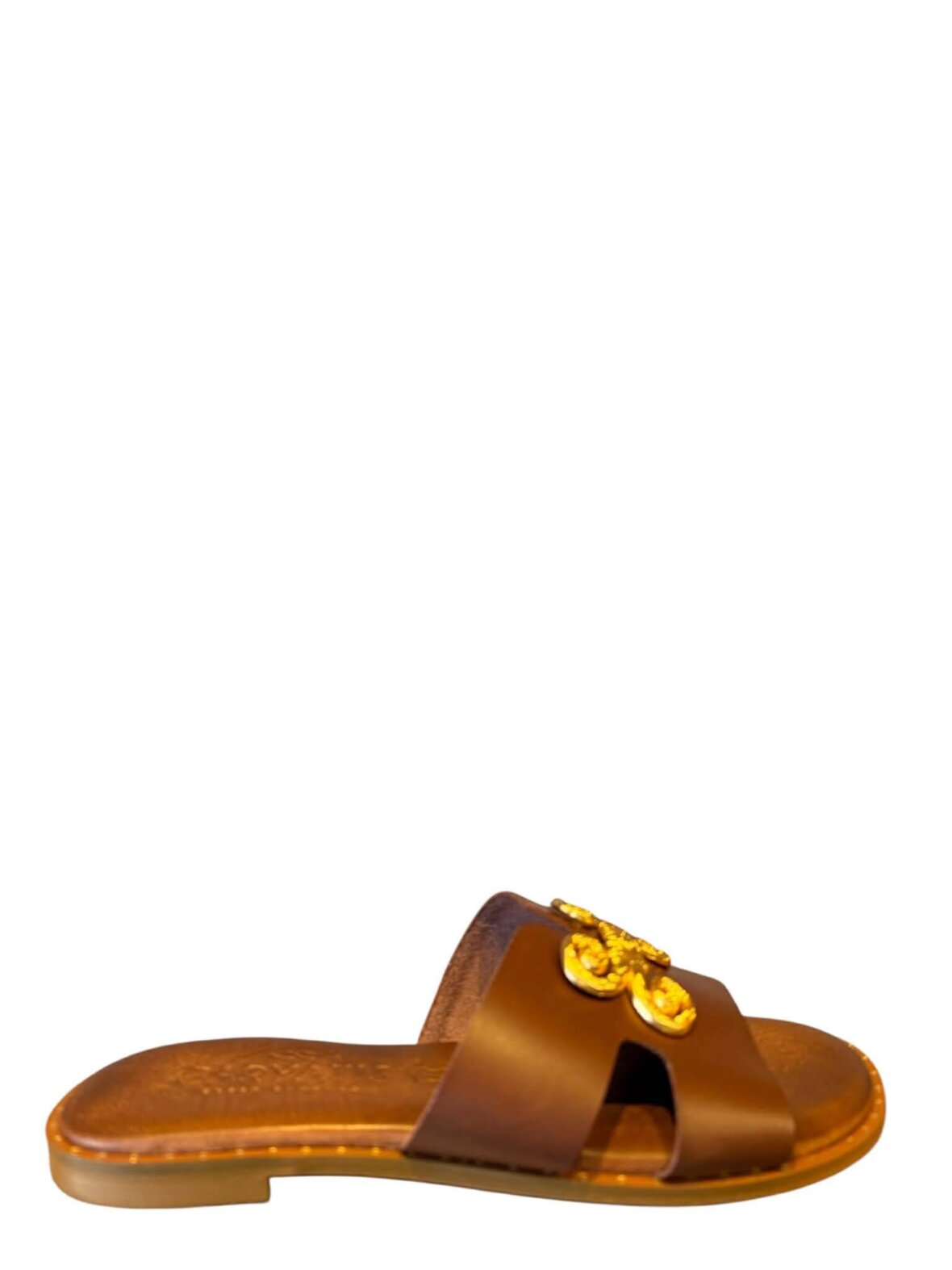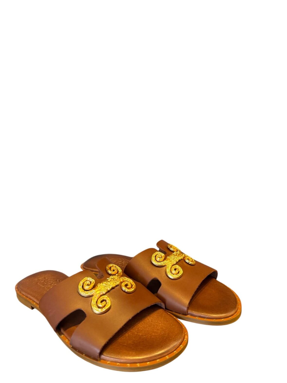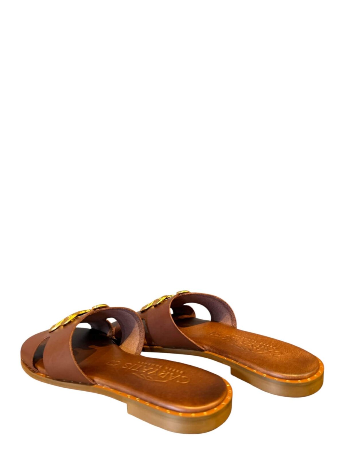Smuk sandal fra Caryatis i cognac farvet skind, med blød komfort. Dekorativ guld over foden.