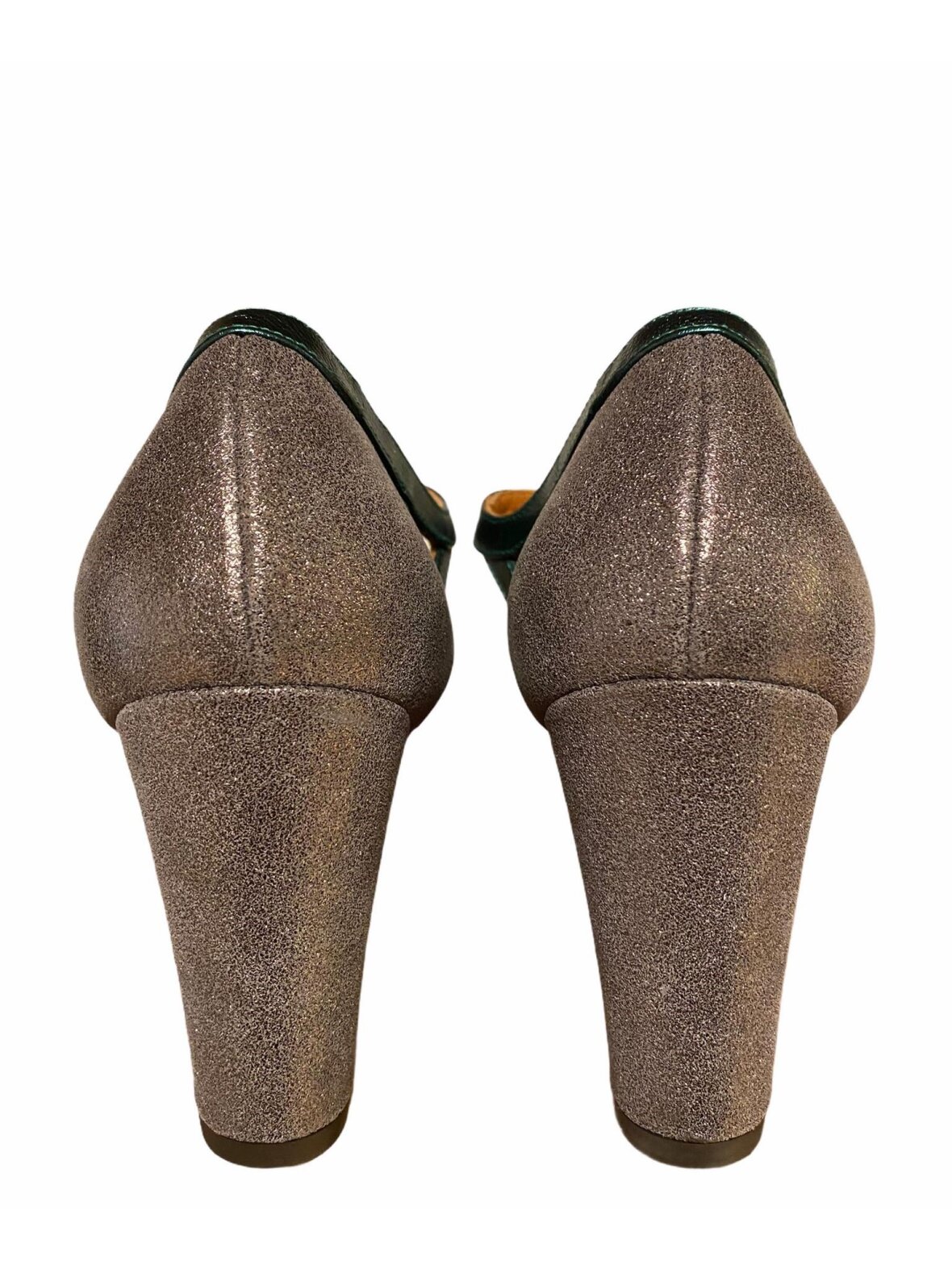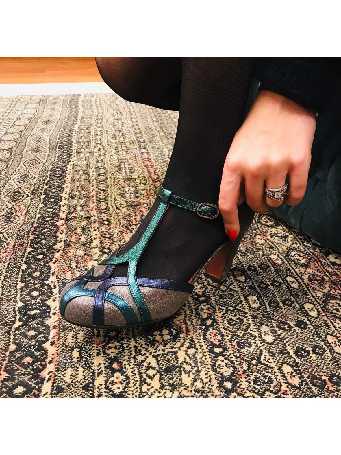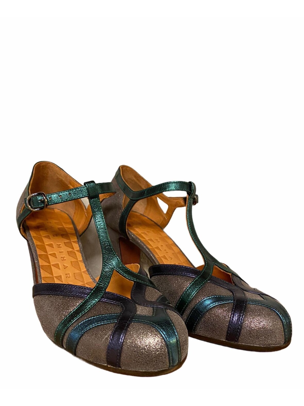 Smuk, elegant og feminin sko i metaltic skind fra CHIE MIHARA. Grøn ankelrem og dekoreret med blå og grøn på snuden. 8,5 cm hælhøjde.