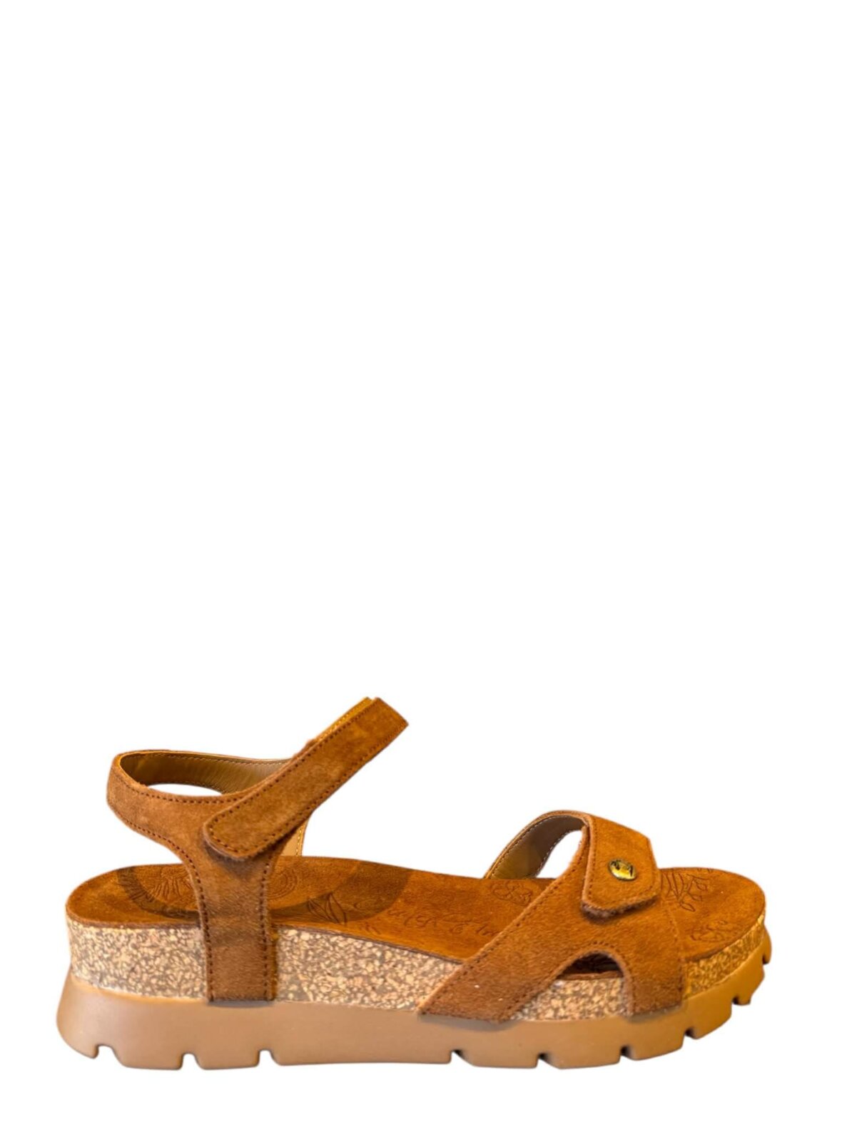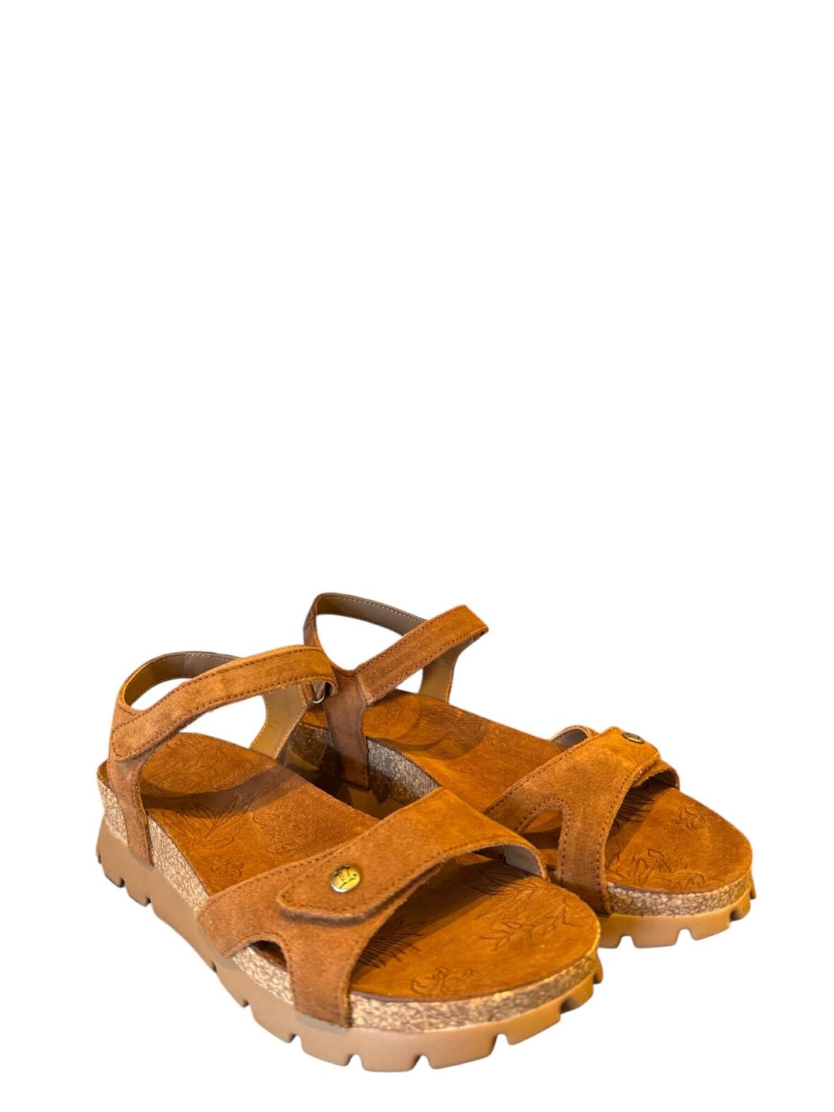 Lækker sandal fra Panama Jack i cognac farvet ruskind, foret med skind. Lukkes med velcro 2 steder. Dejlig blød indersål. Rigtig behagelige og komfortabel til vandreturen.