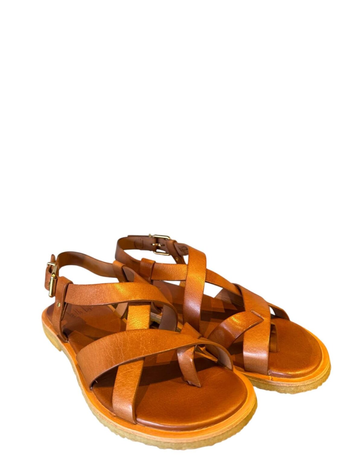 Sandal fra billi bi i cognac-farvet glat skind. Sandalen har stropper der krydser henover hinanden. Lukkes med lille spænde. Sandalen en rågummisål.