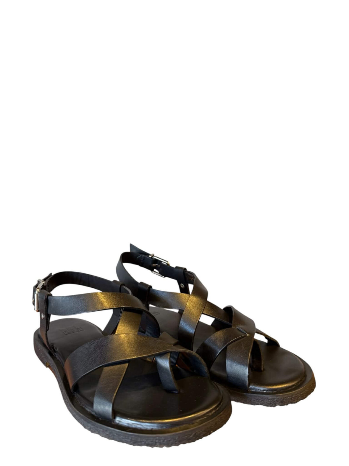 Sandal fra billi bi i sort skind. Sandalen har stropper der krydser henover hinanden. Lukkes med lille spænde. Sandalen en rågummisål.