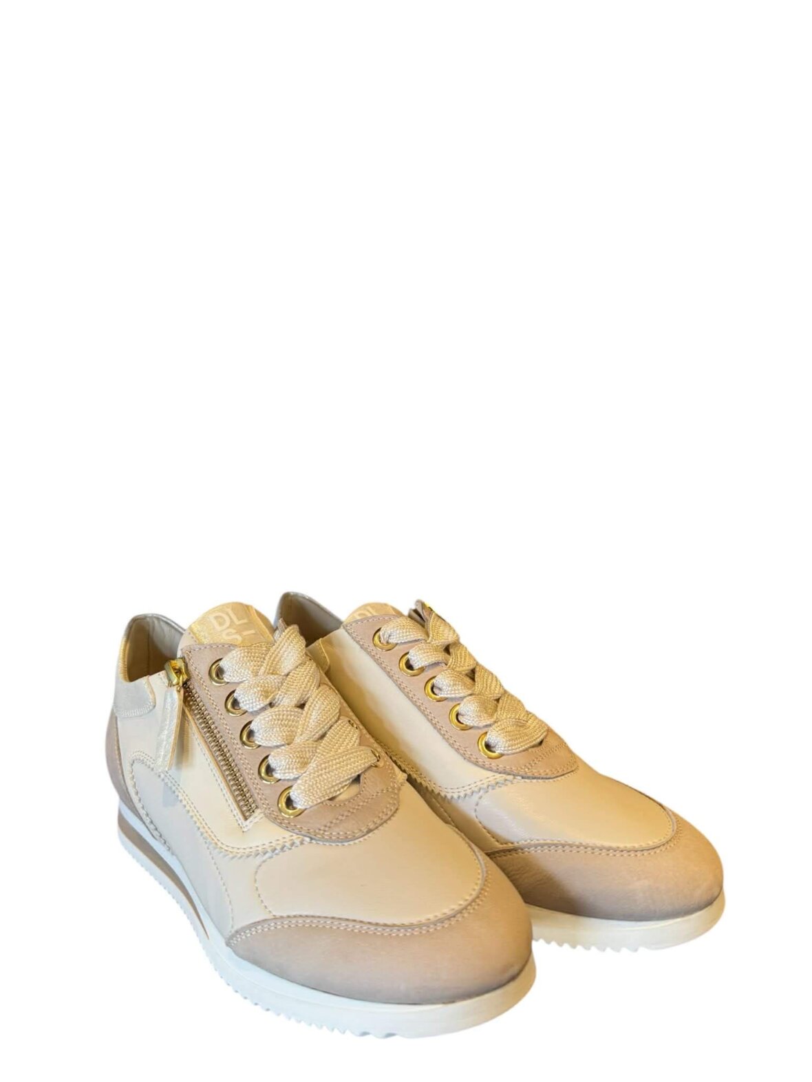 Smart sneaker fra DL Sport i beige toner i skind. Foret med skind. Lynlås på ydersiden.