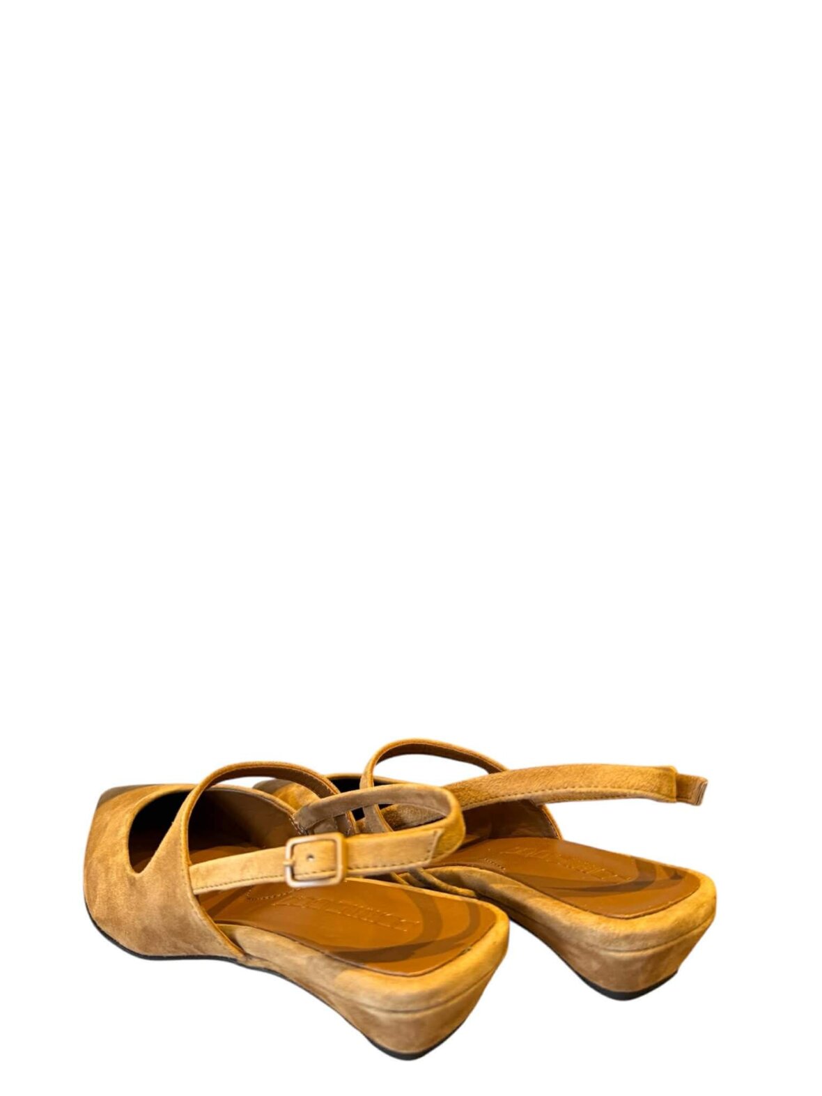Smuk slingback fra Pomme D'or i cognac/biscuit farvet ruskind. Foret med skind. Hælrem kan justeres med det lille spænde. Hælhøjde 3 cm