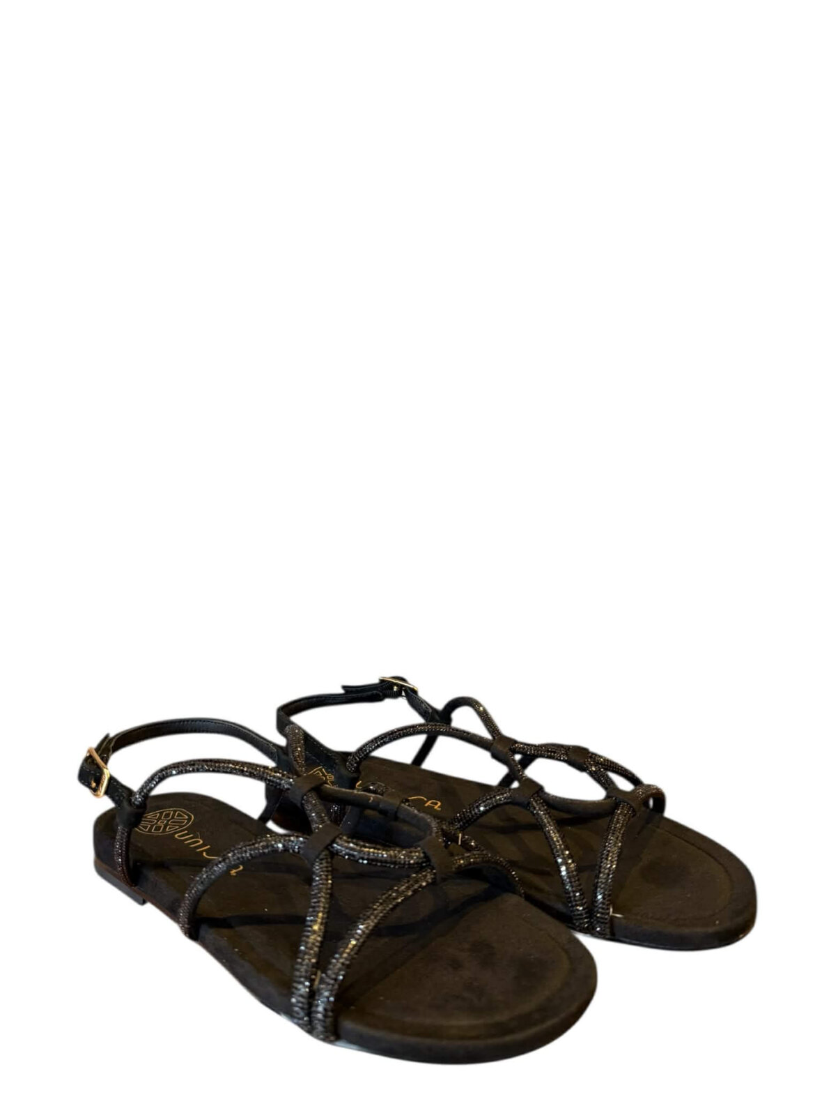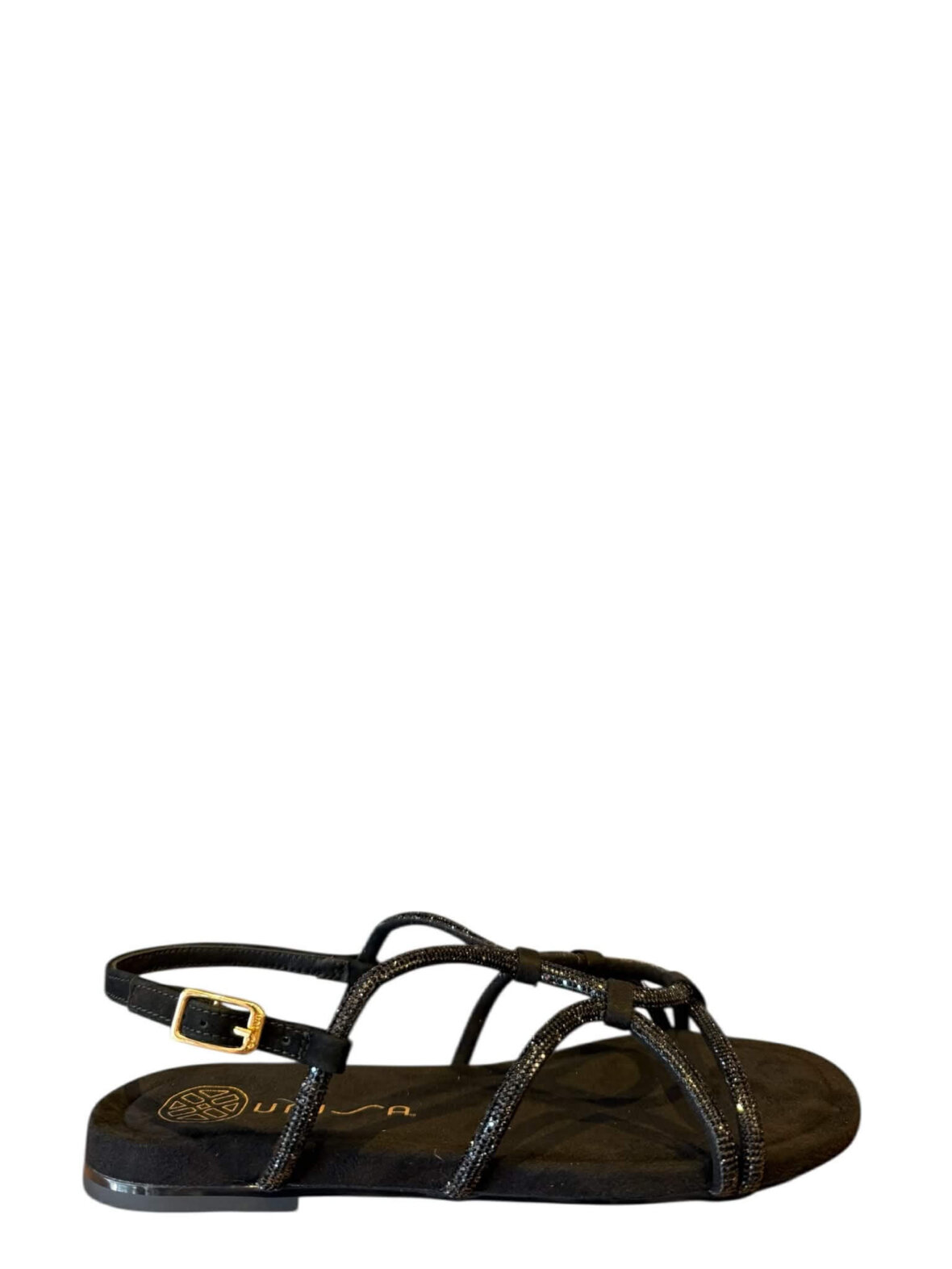 Smuk sandal fra Unisa i sort ruskind og små sorte sten. Lukkes med et lille spænde der kan justeres.