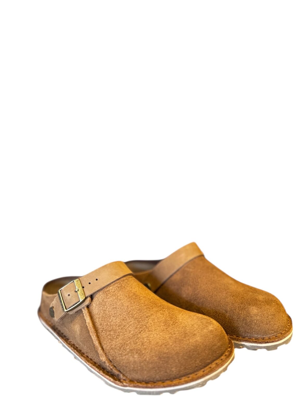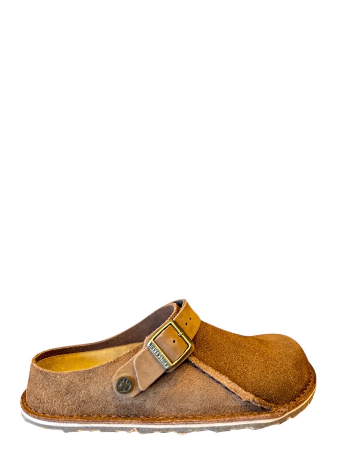 Smart Birkenstock til både damer og herrer i dark tea ruskind. Rem der kan sidde om hælen og også kan flyttes op over vristen.