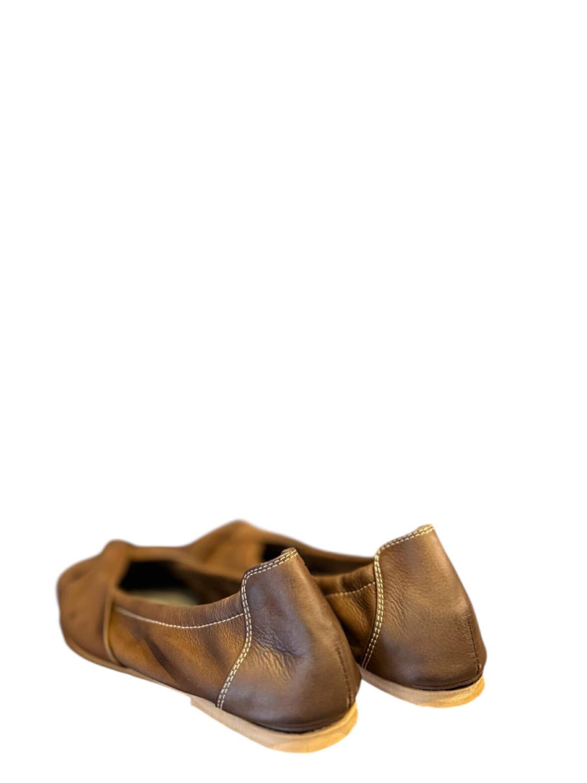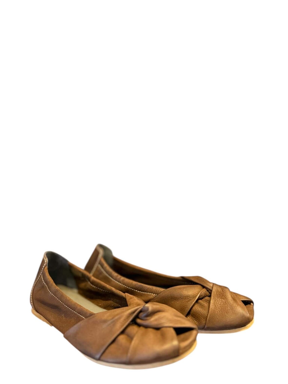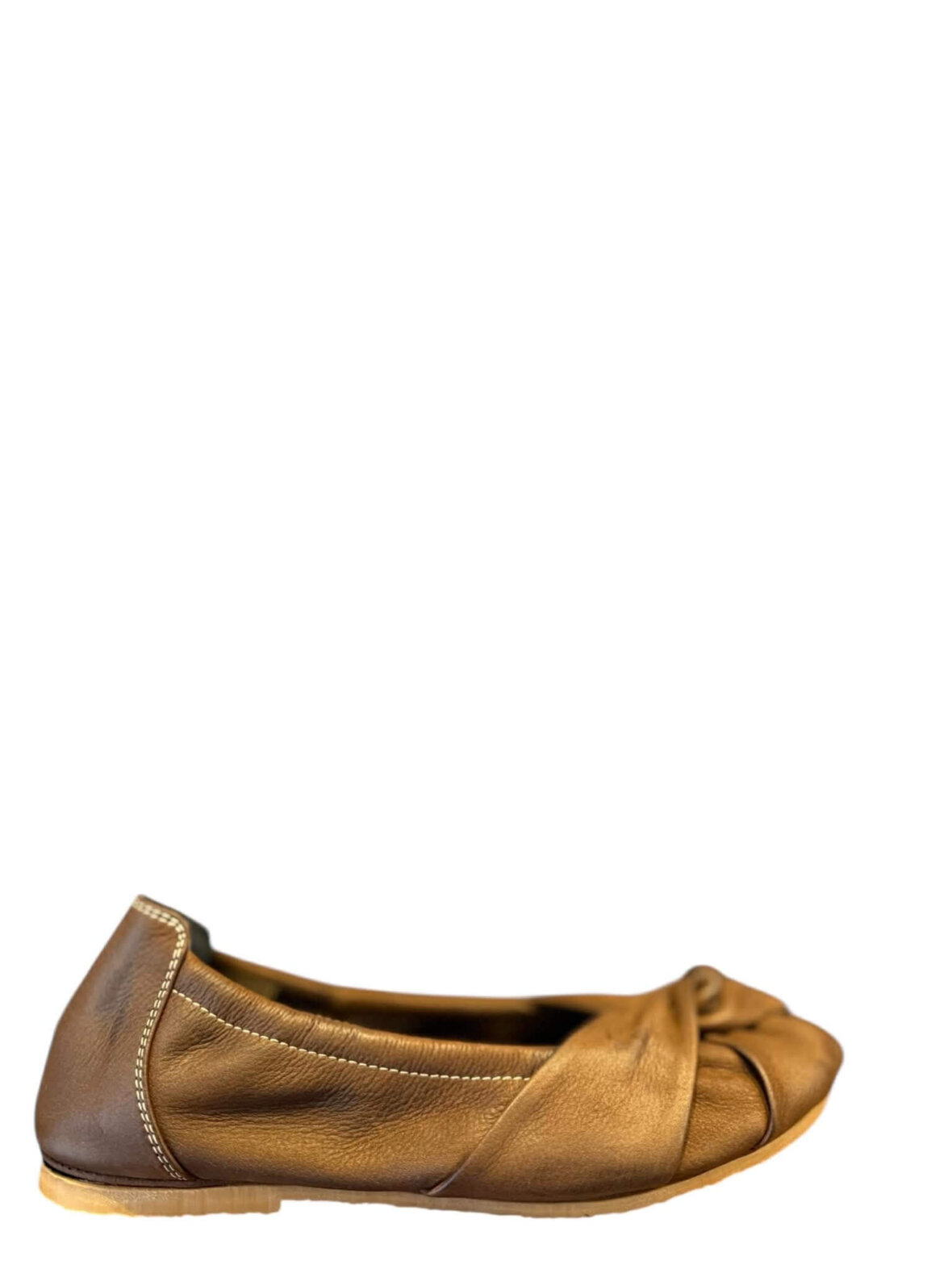 Håndsyet ballerina fra Lofina blødt brunt kalveskind. Ballerinaen har en knude på forfoden og en lille åbning ved tåen. Sålen er en gummisål.