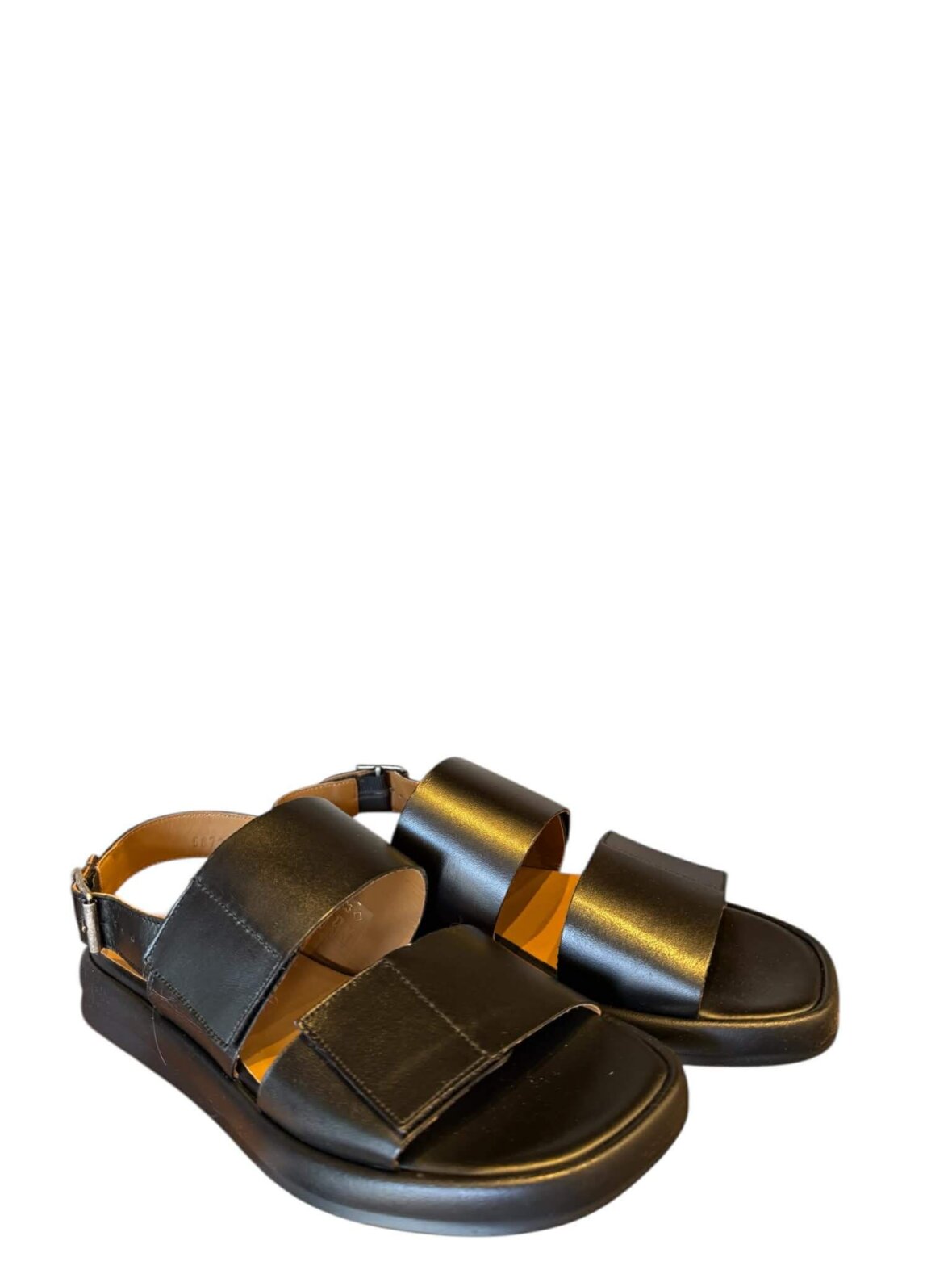 Sandal fra Angulus i sort skind, foret med skind. Spænde der kan justeres ved hælrem - samt velvro 2 steder over foden.