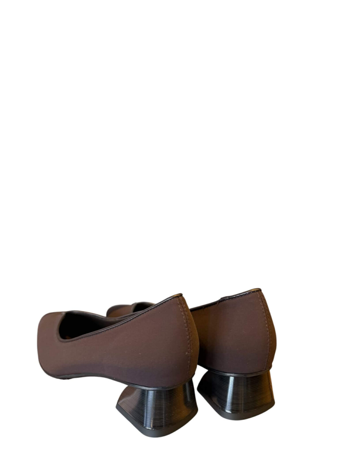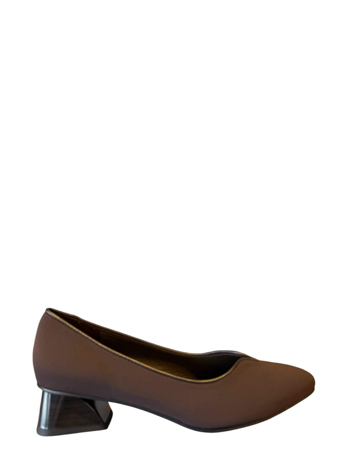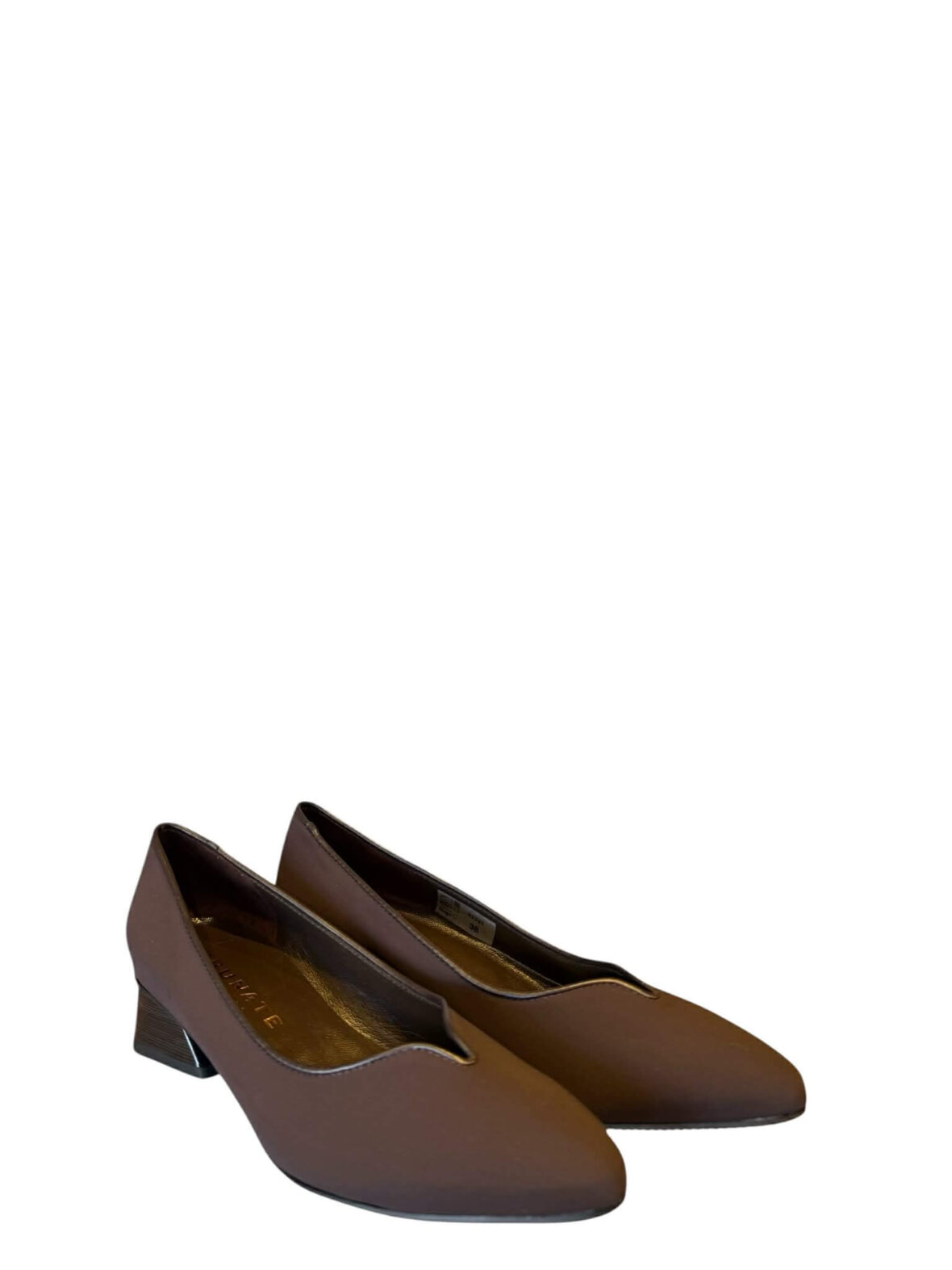 Klassisk pumps fra Brunate i brun tekstil, foret med skind. Kantet med brunt skind. Hæl med lak samt en højde på 2,5 cm