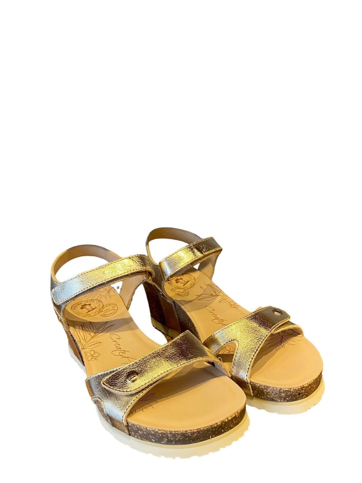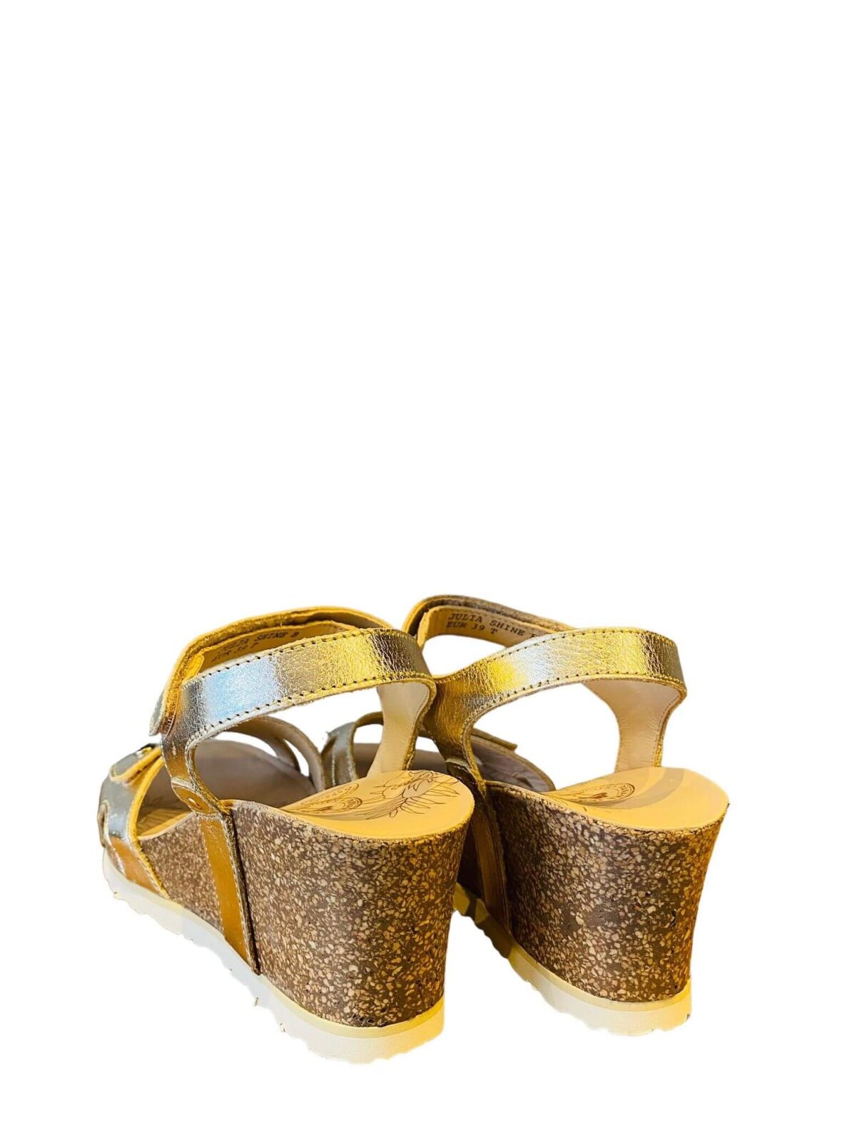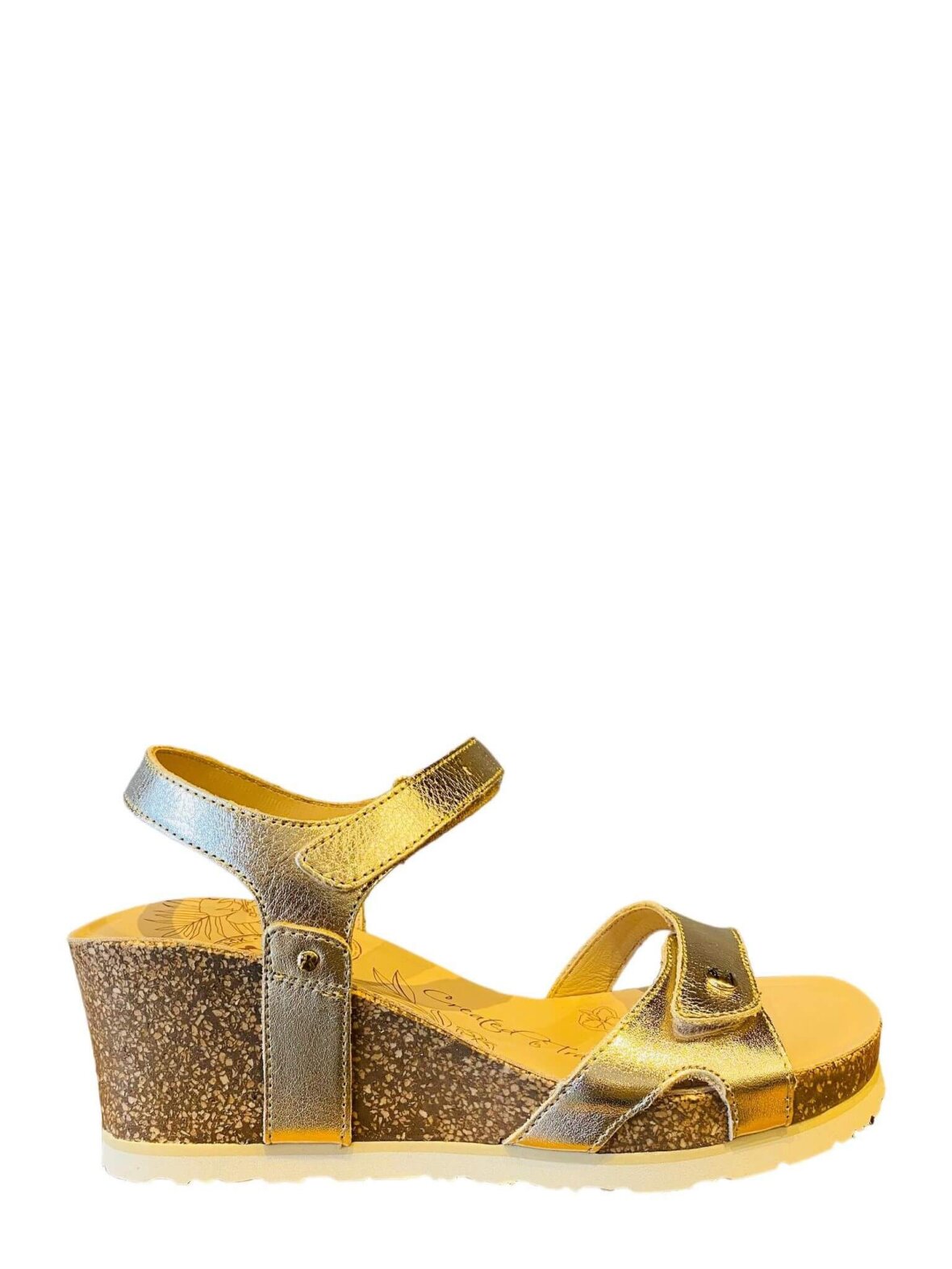 Panama Jack sandal i guld skind, foret med skind. - 6 cm kork kilehæl - 2 cm plateau. Lukkes med velcro 2 steder Dejlig blød indersål. Rigtig behagelige og komfortabel at have på.