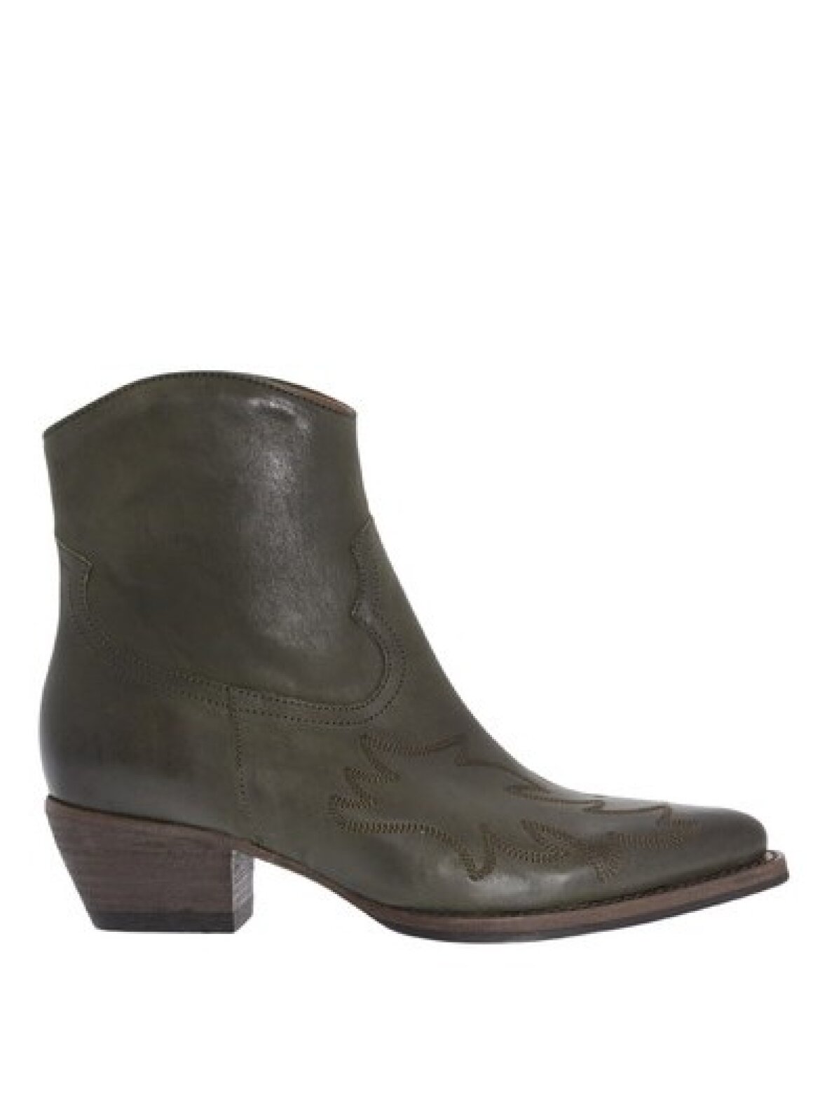 Flot western-inspireret ankelstøvle fra Bill Bi i mat oliven farvet skind med en spids snude og en mellem høj chunky hæl. Støvlen er dekoreret med karakteristiske stikninger på forfod samt skaft. Yderligere har støvlen en diskret lynlås på indersiden. Foret med skind. Hælhøjde 5,5 cm