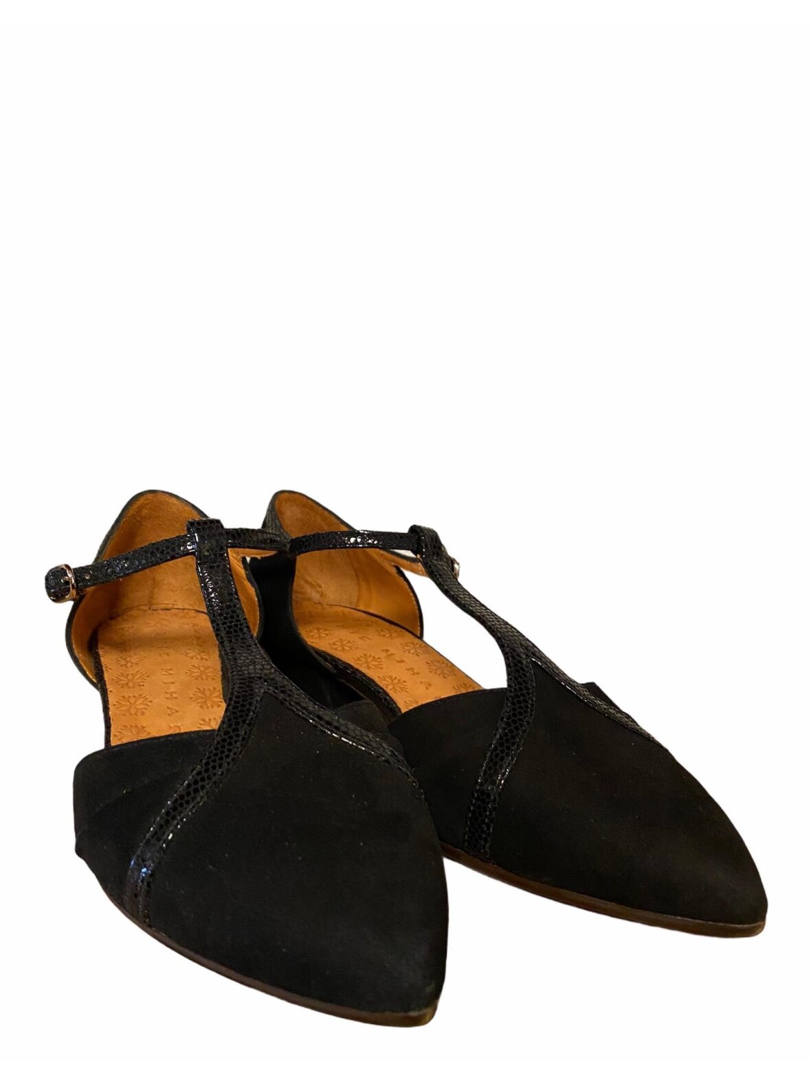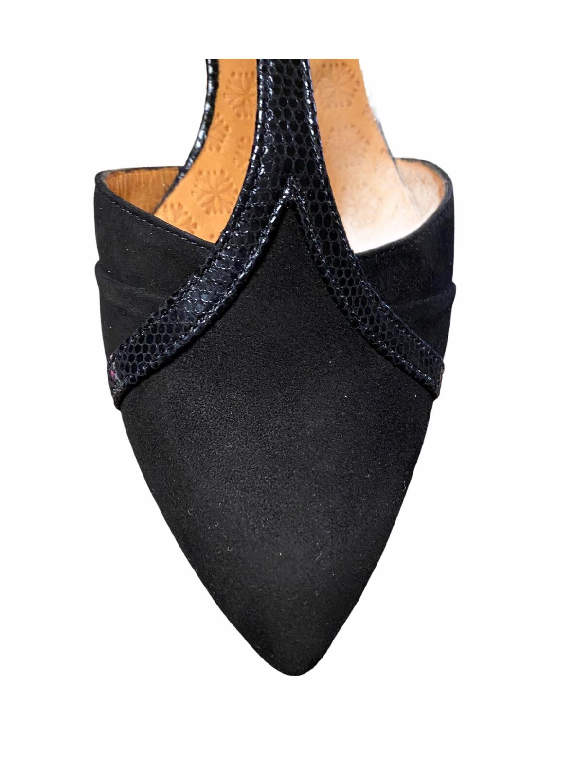 Pumps fra Chie Mihara i sort ruskind, dekoreret med sort skind i præget snake. Foret med skind. Tynd rem over vristen der lukkes med et lille sølv spænde. Hælhøjde: 3,5 cm
