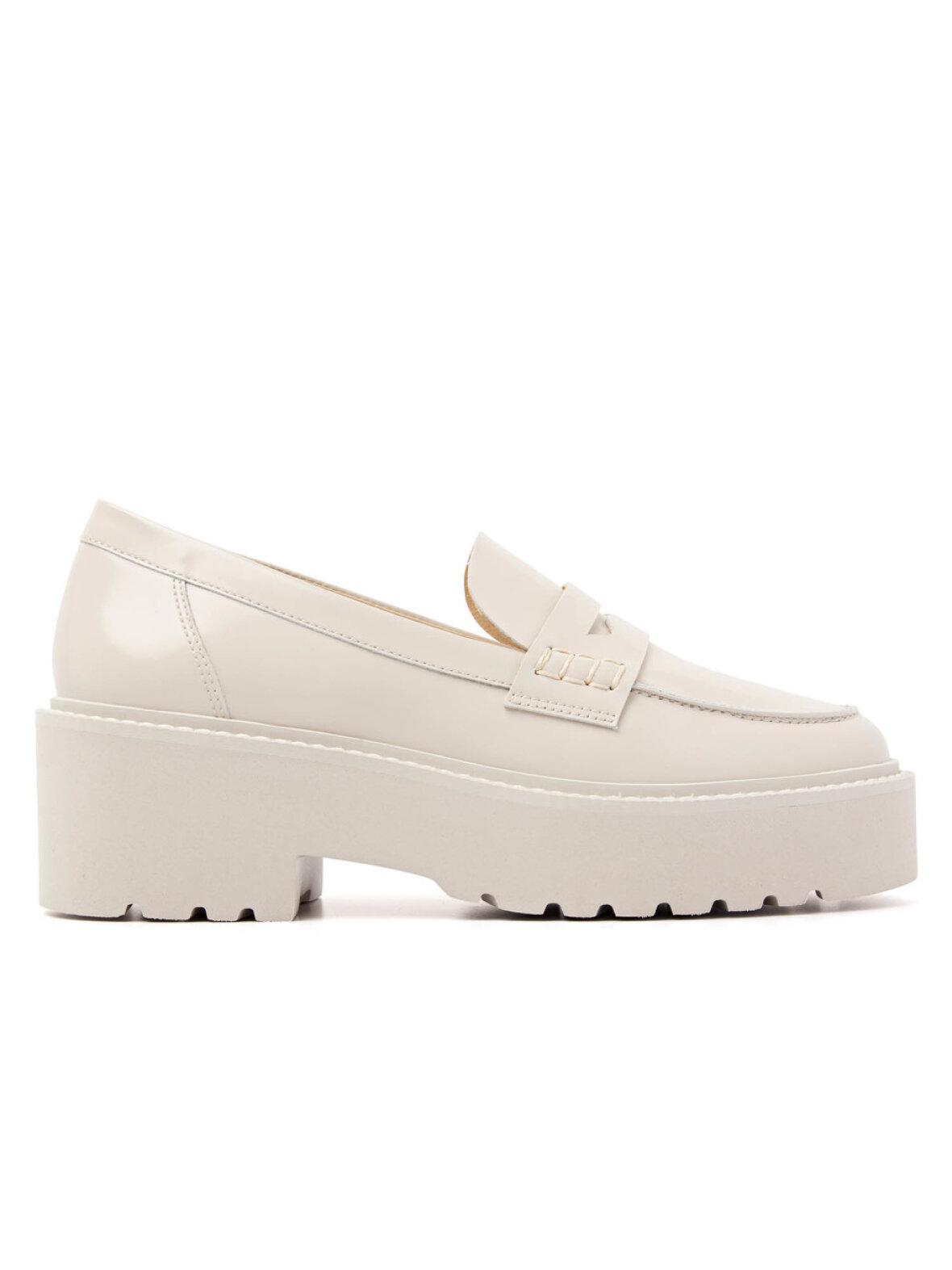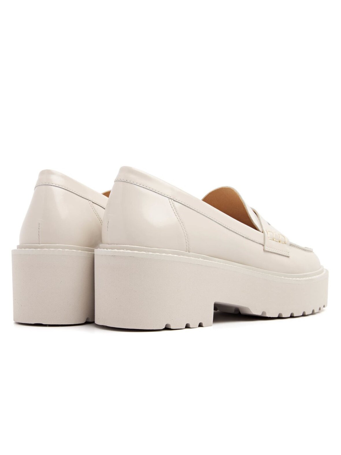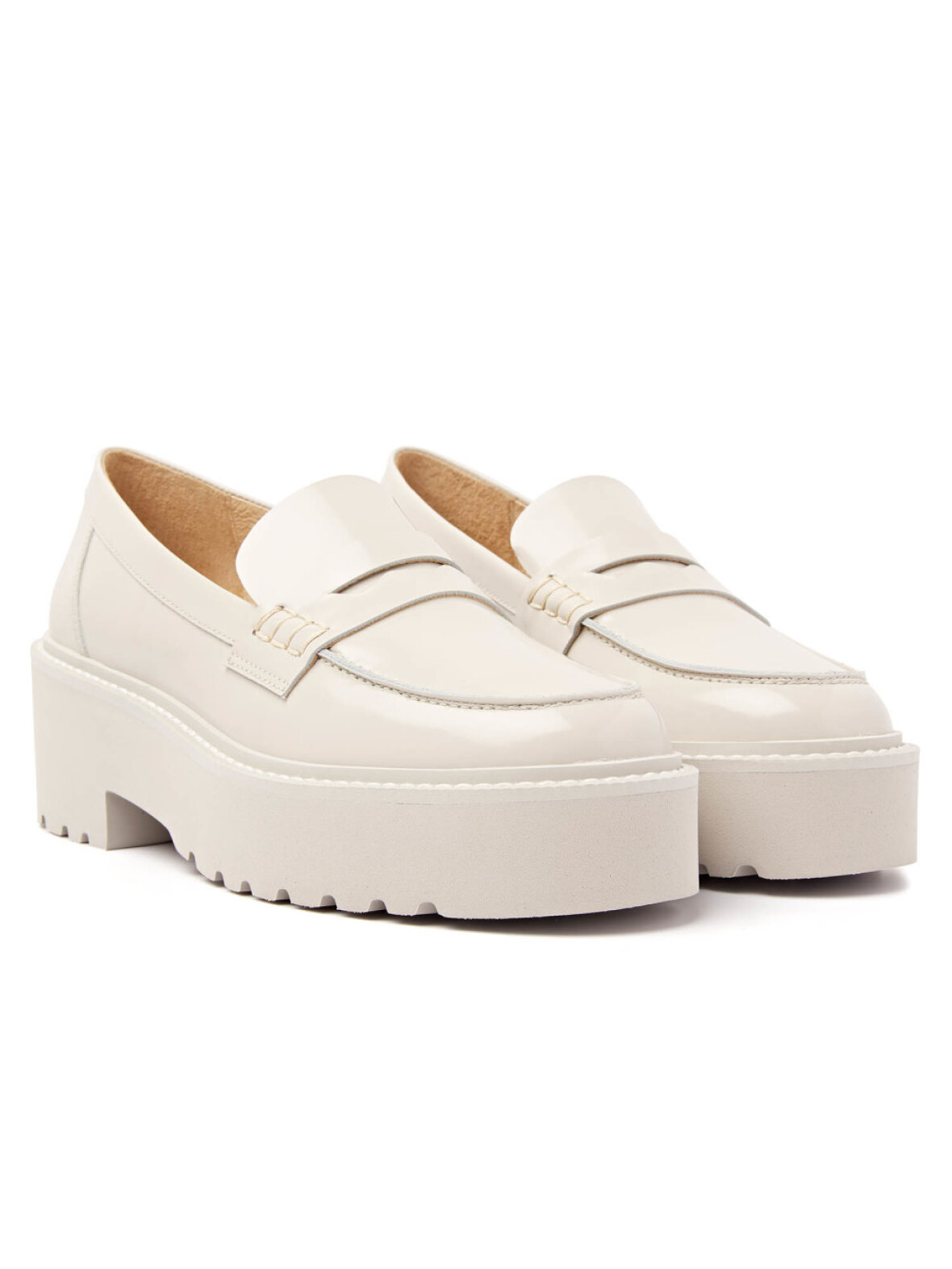 Klassisk loafers fra Via Vai i lys beige polido skind med et kantet twist. Vriststrop med udskæring og tyk plateau sål. Hælhøjde 5,5 cm - Sålens højde 3,5 cm
